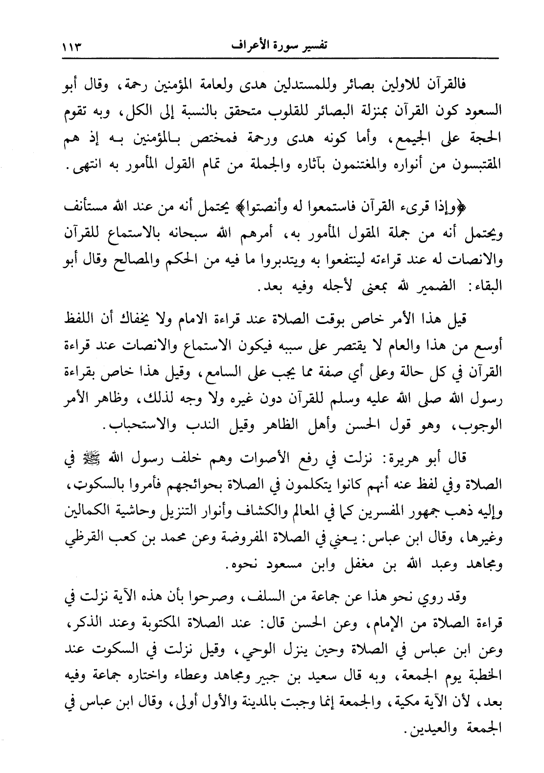 وقد روي نحو هذا عن جماعة من السلف، وصرحوا بأن هذه الآية نزلت في قراءة الصلاة من الإمام، وعن الحسن قال: عند الصلاة المكتوبة وعند الذكر، وعن ابن عباس في الصلاة وحين ينزل الوحي، وقيل نزلت في السكوت عند الخطبة يوم الجمعة، وبه قال سعيد بن جبير ومجاهد وعطاء واختاره جماعة وفيه بعد، لأن الآية مكية، والجمعة إنما وجبت بالمدينة والأول أولى، وقال ابن عباس في الجمعة والعيدين.