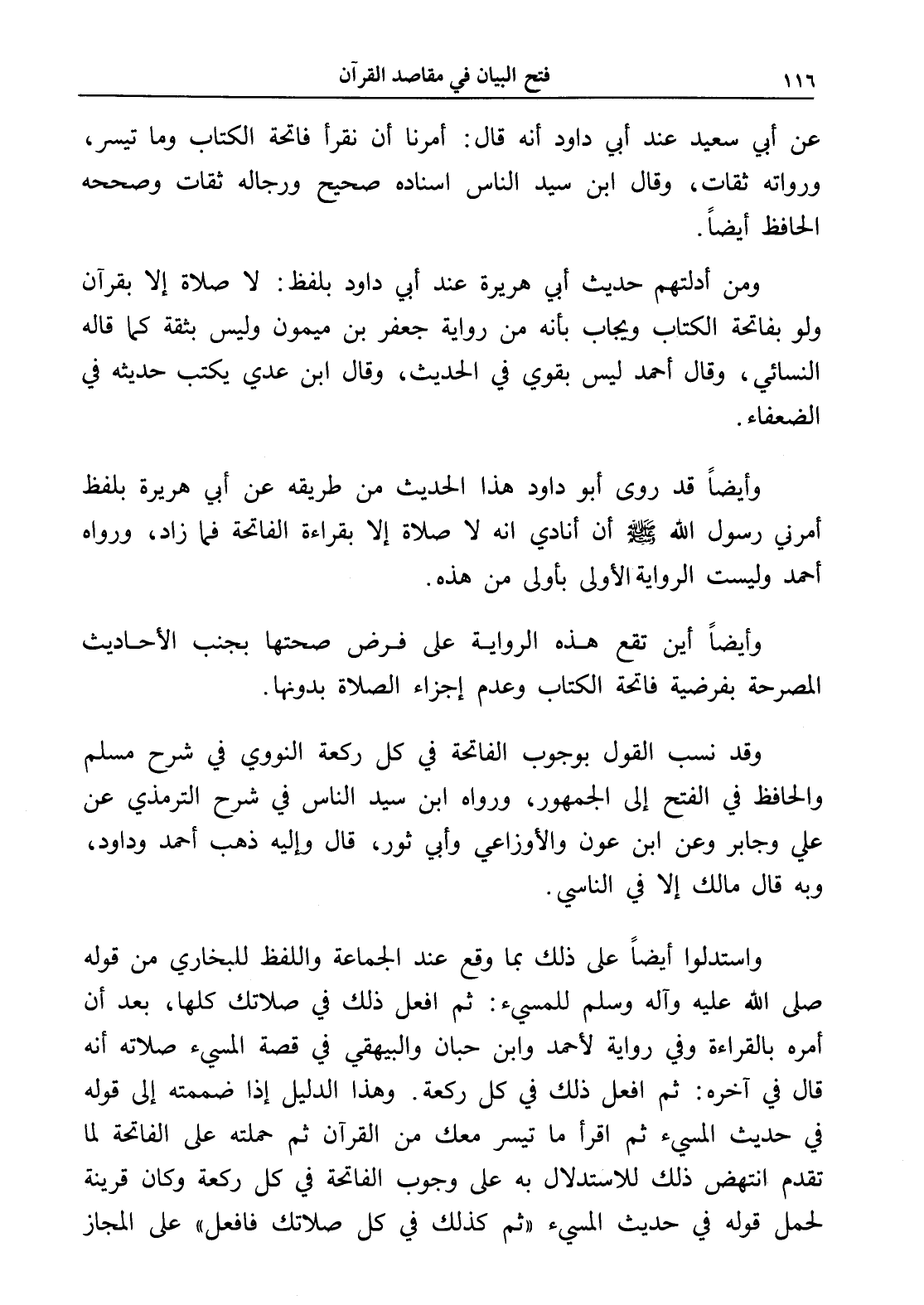 ومن أدلتهم حديث أبي هريرة عند أبي داود بلفظ: لا صلاة إلا بقرآن ولو بفاتحة الكتاب ويجاب بأنه من رواية جعفر بن ميمون وليس بثقة كما قاله النسائي، وقال أحمد ليس بقوي في الحديث، وقال ابن عدي يكتب حديثه في الضعفاء.