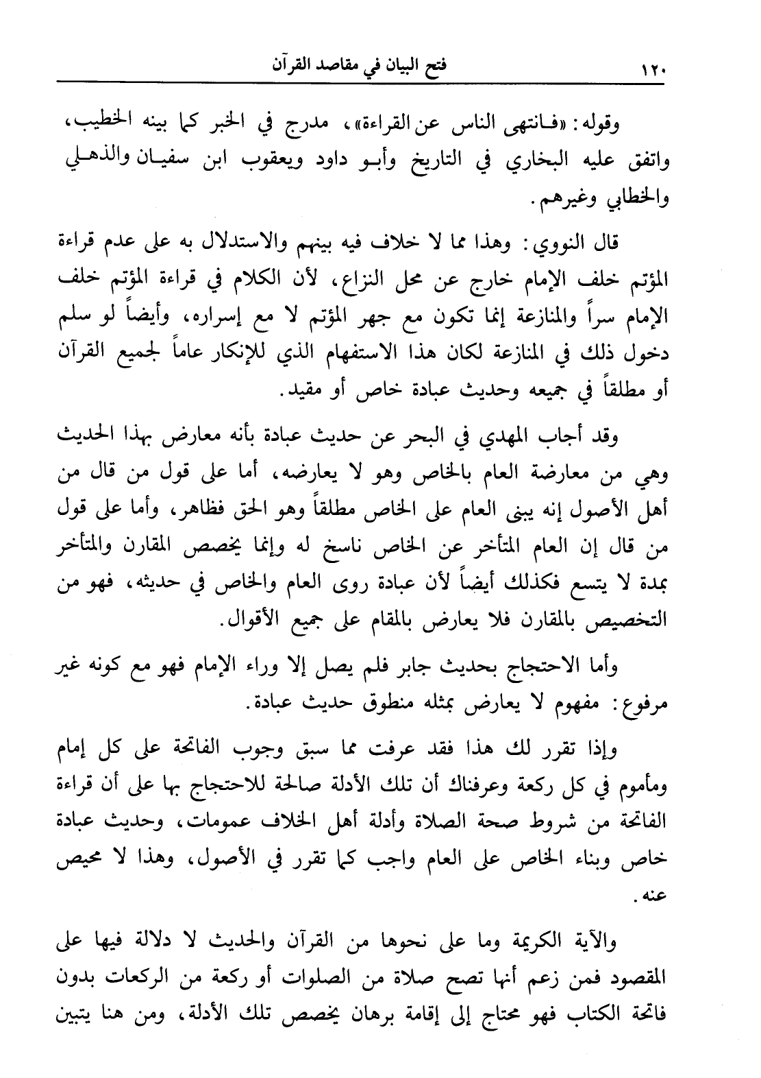 قال النووي: وهذا مما لا خلاف فيه بينهم والاستدلال به على عدم قراءة المؤتم خلف الإمام خارج عن محل النزاع، لأن الكلام في قراءة المؤتم خلف الإمام سراً والمنازعة إنما تكون مع جهر المؤتم لا مع إسراره، وأيضاً لو سلم دخول ذلك في المنازعة لكان هذا الاستفهام الذي للإنكار عاماً لجميع القرآن أو مطلقاً في جميعه وحديث عبادة خاص أو مقيد.