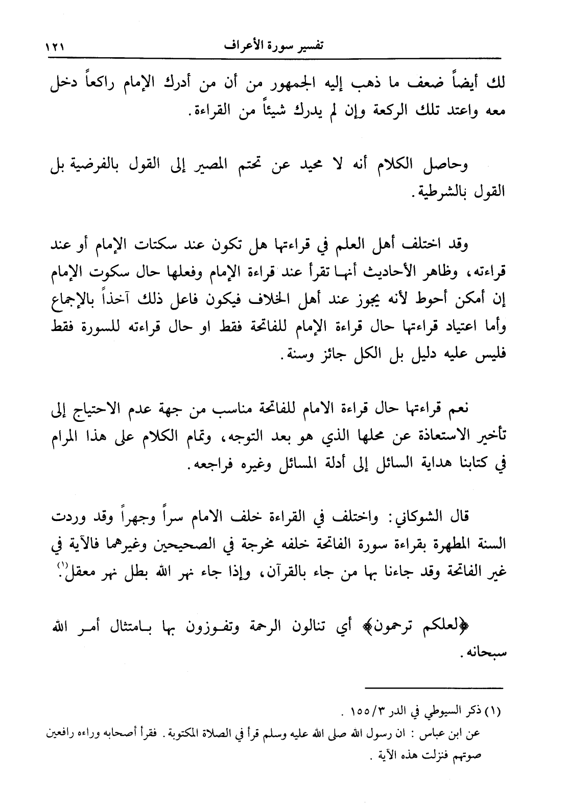 قال الشوكاني: واختلف في القراءة خلف الإمام سراً وجهراً وقد وردت السنة المطهرة بقراءة سورة الفاتحة خلفه مخرجة في الصحيحين وغيرهما فالآية في غير الفاتحة وقد جاءنا بها من جاء بالقرآن، وإذا جاء نهر الله بطل نهر معقل (¬1).