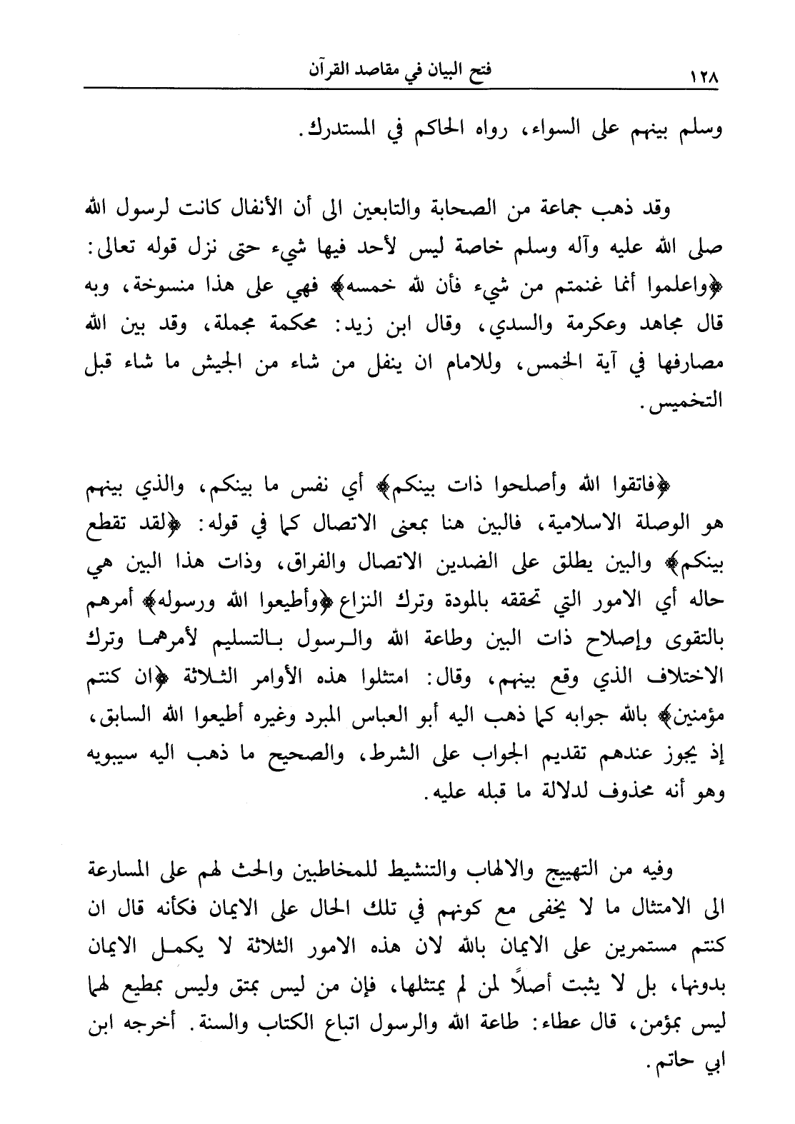 (فاتقوا الله وأصلحوا ذات بينكم) أي نفس ما بينكم، والذي بينهم هو الوصلة الإسلامية، فالبين هنا بمعنى الاتصال كما في قوله: (لقد تقطع بينكم) والبين يطلق على الضدين الاتصال والفراق، وذات هذا البين هي حاله أي الأمور التي تحققه بالمودة وترك النزاع (وأطيعوا الله ورسوله) أمرهم بالتقوى وإصلاح ذات البين وطاعة الله والرسول بالتسليم لأمرهما وترك الاختلاف الذي وقع بينهم، وقال: امتثلوا هذه الأوامر الثلاثة (إن كنتم مؤمنين) بالله جوابه كما ذهب إليه أبو العباس المبرد وغيره أطيعوا الله السابق، إذ يجوز عندهم تقديم الجواب على الشرط، والصحيح ما ذهب إليه سيبويه وهو أنه محذوف لدلالة ما قبله عليه.
