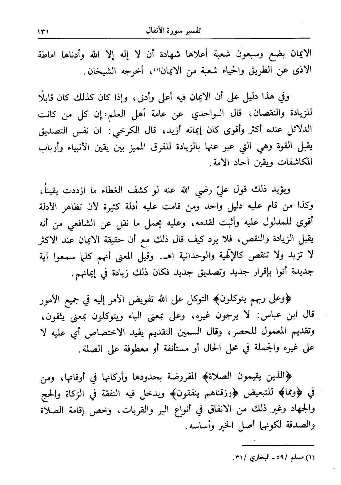 ويؤيد ذلك قول عليّ رضي الله عنه لو كشف الغطاء ما ازددت يقيناً، وكذا من قام عليه دليل واحد ومن قامت عليه أدلة كثيرة لأن تظاهر الأدلة أقوى للمدلول عليه وأثبت لقدمه، وعليه يحمل ما نقل عن الشافعي من أنه يقبل الزيادة والنقص، فلا يرد كيف قال ذلك مع أن حقيقة الإيمان عند الأكثر لا تزيد ولا تنقص كالإلهية والوحدانية اهـ. وقيل المعنى أنهم كلما سمعوا آية جديدة أتوا بإقرار جديد وتصديق جديد فكان ذلك زيادة في إيمانهم.