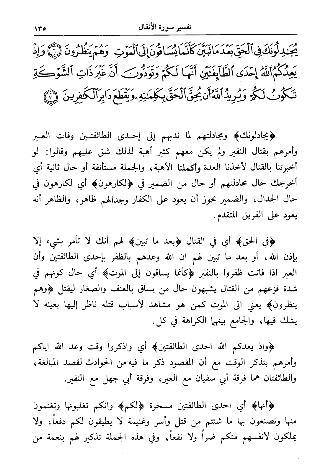 يُجَادِلُونَكَ فِي الْحَقِّ بَعْدَمَا تَبَيَّنَ كَأَنَّمَا يُسَاقُونَ إِلَى الْمَوْتِ وَهُمْ يَنْظُرُونَ (6) وَإِذْ يَعِدُكُمُ اللَّهُ إِحْدَى الطَّائِفَتَيْنِ أَنَّهَا لَكُمْ وَتَوَدُّونَ أَنَّ غَيْرَ ذَاتِ الشَّوْكَةِ تَكُونُ لَكُمْ وَيُرِيدُ اللَّهُ أَنْ يُحِقَّ الْحَقَّ بِكَلِمَاتِهِ وَيَقْطَعَ دَابِرَ الْكَافِرِينَ (7)
