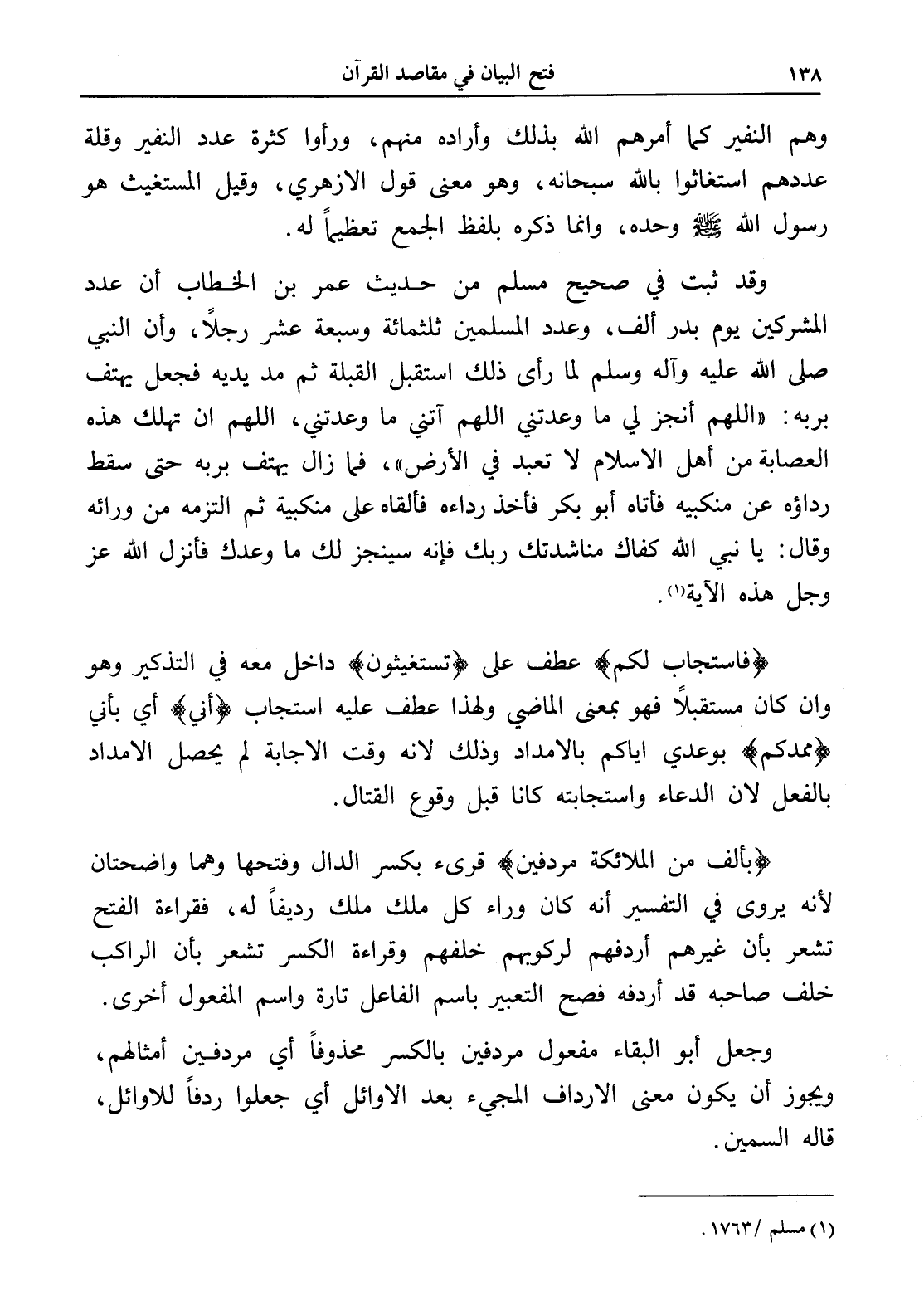 وقد ثبت في صحيح مسلم من حديث عمر بن الخطاب أن عدد المشركين يوم بدر ألف، وعدد المسلمين ثلثمائة وسبعة عشر رجلاً، وأن النبي صلى الله عليه وآله وسلم لما رأى ذلك استقبل القبلة ثم مد يديه فجعل يهتف بربه: " اللهم أنجز لي ما وعدتني اللهم آتني ما وعدتني، اللهم إن تهلك هذه العصابة من أهل الإسلام لا تعبد في الأرض "، فما زال يهتف بربه حتى سقط رداؤه عن منكبيه فأتاه أبو بكر فأخذ رداءه فألقاه على منكبية ثم التزمه من ورائه وقال: يا نبي الله كفاك مناشدتك ربك فإنه سينجز لك ما وعدك فأنزل الله عز وجل هذه الآية (¬1).