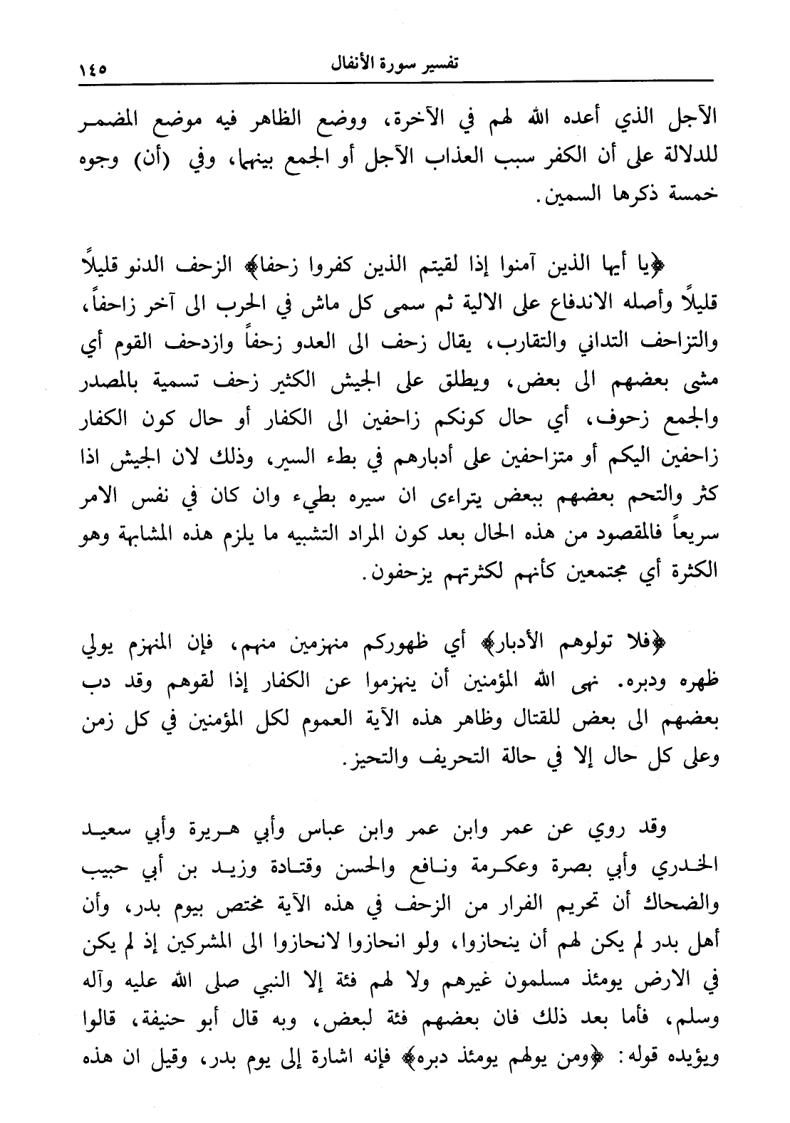 (يا أيها الذين آمنوا إذا لقيتم الذين كفروا زحفاً) الزحف الدنو قليلاً قليلاً وأصله الإندفاع على الآلية ثم سمى كل ماش في الحرب إلى آخر زاحفاً، والتزاحف التداني والتقارب، يقال زحف إلى العدو زحفاً وازدحف القوم أي مشى بعضهم إلى بعض، ويطلق على الجيش الكثير زحف تسمية بالمصدر والجمع زحوف، أي حال كونكم زاحفين إلى الكفار أو حال كون الكفار زاحفين إليكم أو متزاحفين على أدبارهم في بطء السير، وذلك لأن الجيش إذا كثر والتحم بعضهم ببعض يتراءى أن سيره بطيء وإن كان في نفس الأمر سريعاً فالمقصود من هذه الحال بعد كون المراد التشبيه ما يلزم هذه المشابهة وهو الكثرة أي مجتمعين كأنهم لكثرتهم يزحفون.
