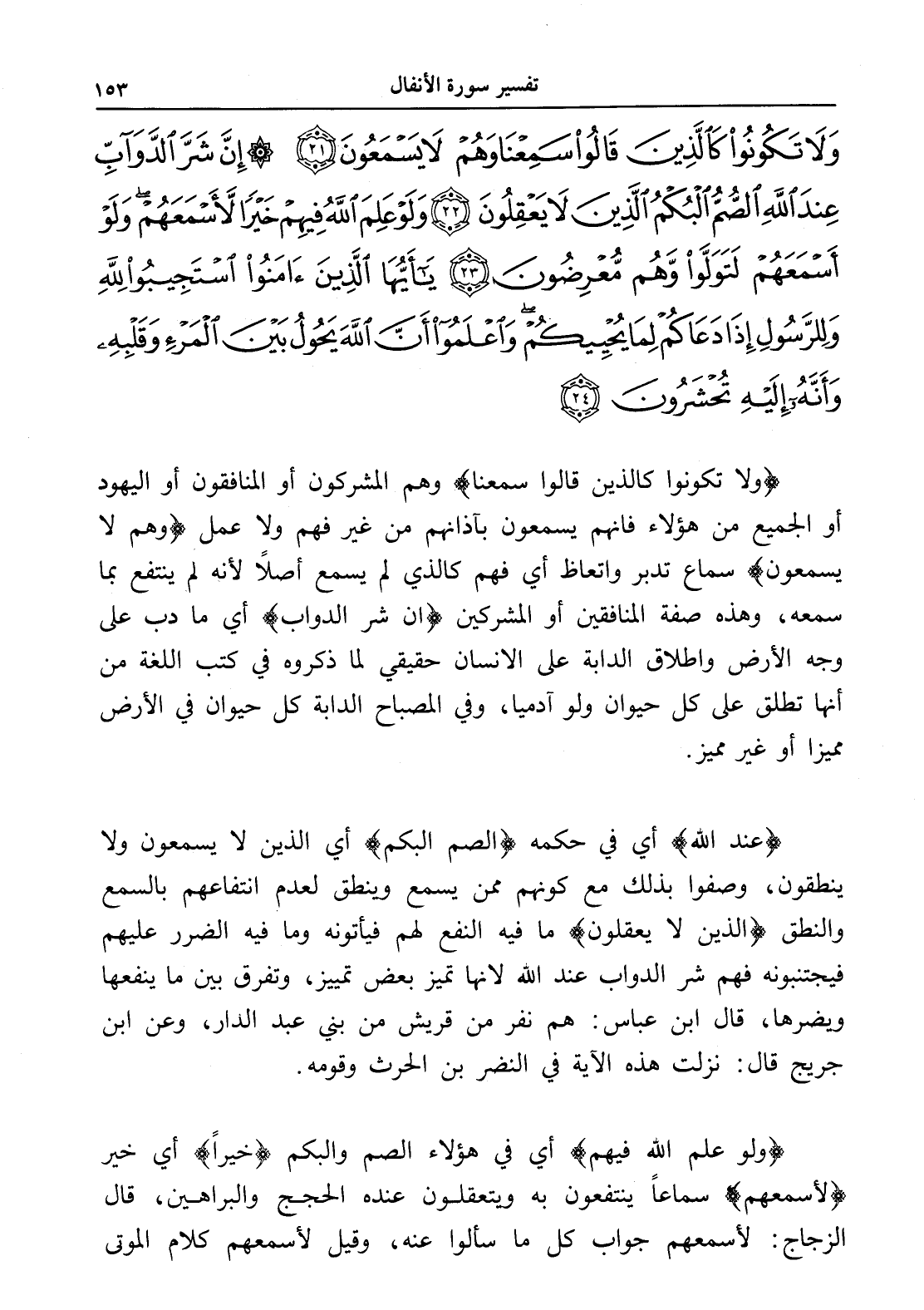 وَلَا تَكُونُوا كَالَّذِينَ قَالُوا سَمِعْنَا وَهُمْ لَا يَسْمَعُونَ (21) إِنَّ شَرَّ الدَّوَابِّ عِنْدَ اللَّهِ الصُّمُّ الْبُكْمُ الَّذِينَ لَا يَعْقِلُونَ (22) وَلَوْ عَلِمَ اللَّهُ فِيهِمْ خَيْرًا لَأَسْمَعَهُمْ وَلَوْ أَسْمَعَهُمْ لَتَوَلَّوْا وَهُمْ مُعْرِضُونَ (23) يَا أَيُّهَا الَّذِينَ آمَنُوا اسْتَجِيبُوا لِلَّهِ وَلِلرَّسُولِ إِذَا دَعَاكُمْ لِمَا يُحْيِيكُمْ وَاعْلَمُوا أَنَّ اللَّهَ يَحُولُ بَيْنَ الْمَرْءِ وَقَلْبِهِ وَأَنَّهُ إِلَيْهِ تُحْشَرُونَ (24)