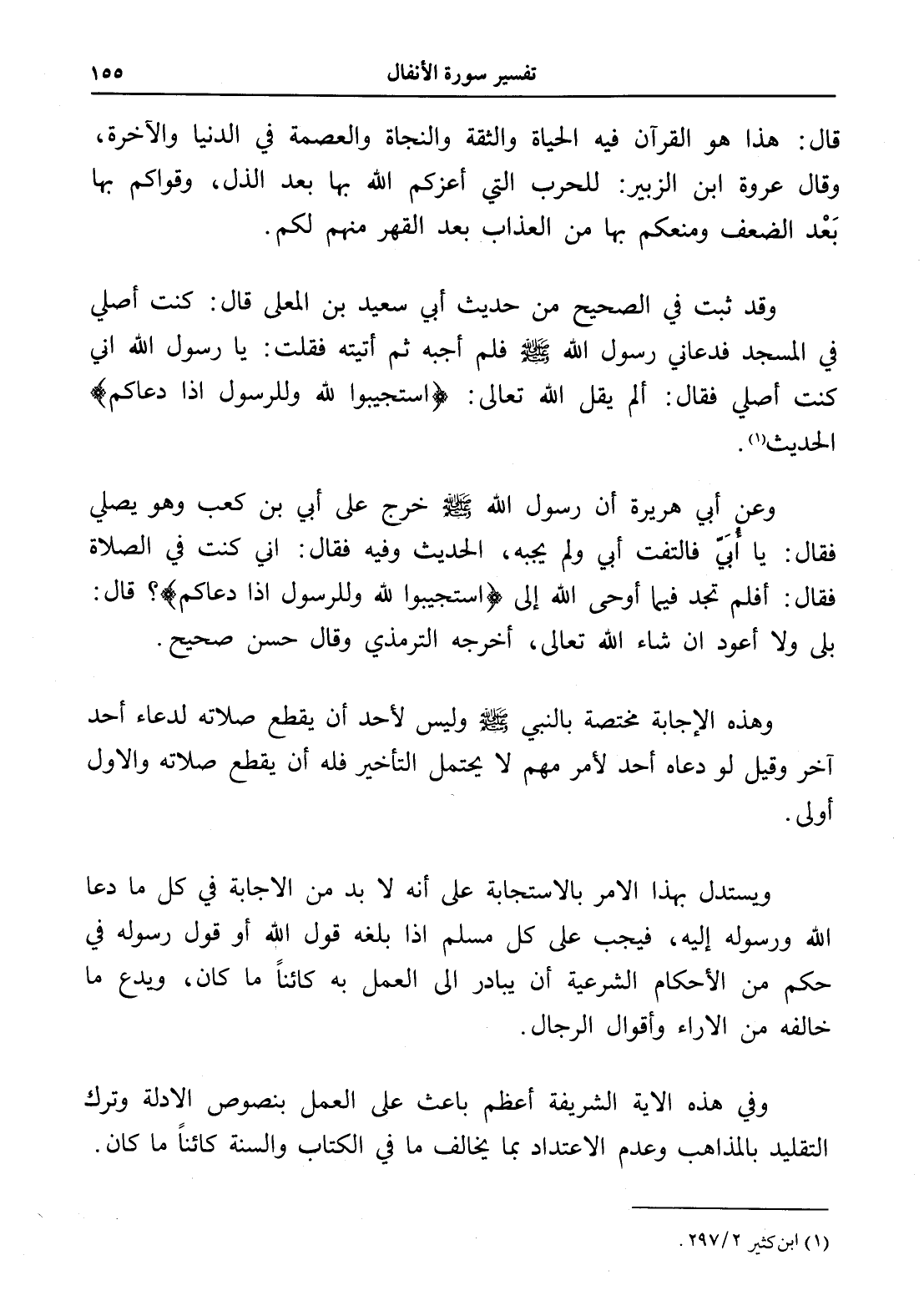 وقد ثبت في الصحيح من حديث أبي سعيد بن المعلى قال: كنت أصلي في المسجد فدعاني رسول الله - صلى الله عليه وسلم - فلم أجبه ثم أتيته فقلت: يا رسول الله إني كنت أصلي فقال: ألم يقل الله تعالى: (استجيبوا لله وللرسول إذا دعاكم) الحديث (¬1).