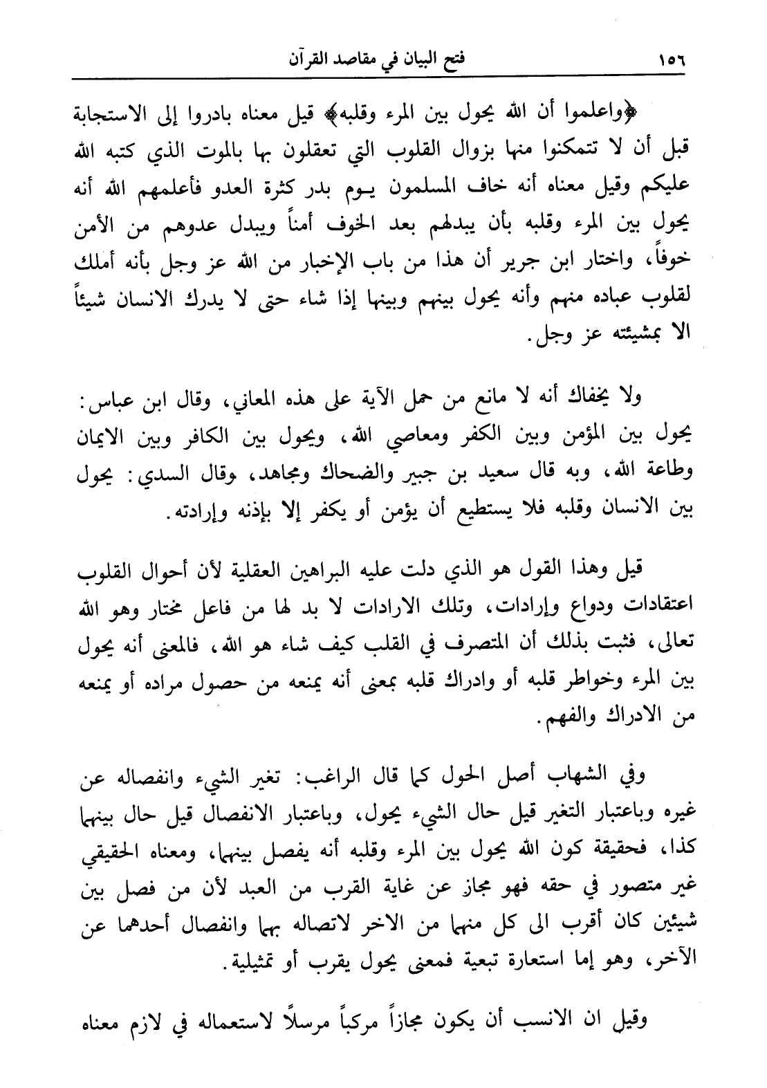 قيل وهذا القول هو الذي دلت عليه البراهين العقلية لأن أحوال القلوب اعتقادات ودواع وإرادات، وتلك الإرادات لا بد لها من فاعل مختار وهو الله تعالى، فثبت بذلك أن المتصرف في القلب كيف شاء هو الله، فالمعنى أنه يحول بين المرء وخواطر قلبه أو وإدراك قلبه بمعنى أنه يمنعه من حصول مراده أو يمنعه من الإدراك والفهم.