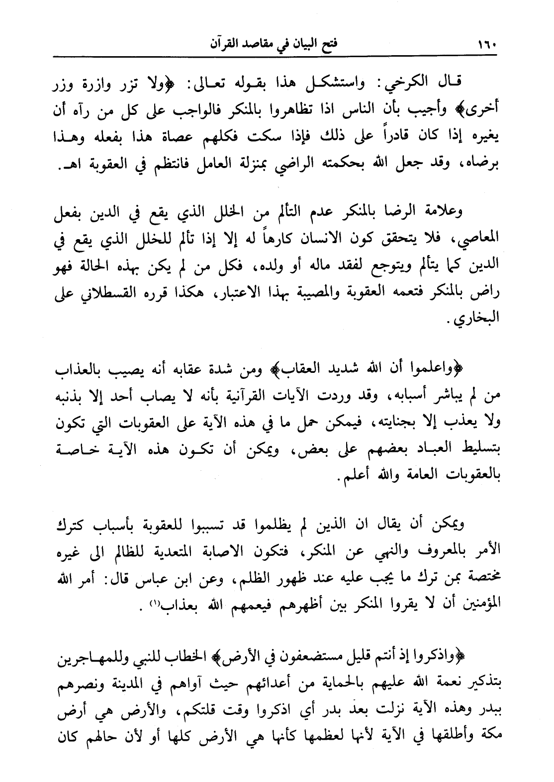 قال الكرخي: واستشكل هذا بقوله تعالى: (ولا تزر وازرة وزر أخرى) وأجيب بأن الناس إذا تظاهروا بالمنكر فالواجب على كل من رآه أن يغيره إذا كان قادراً على ذلك فإذا سكت فكلهم عصاة هذا بفعله وهذا برضاه، وقد جعل الله بحكمته الراضي بمنزلة العامل فانتظم في العقوبة اهـ.
