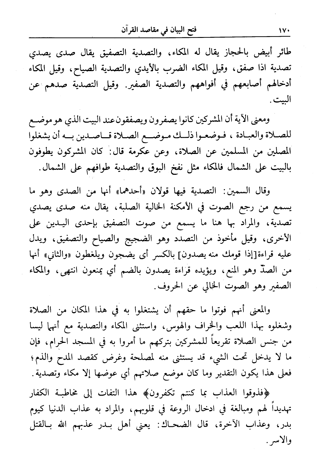 وقال السمين: التصدية فيها قولان " أحدهما " أنها من الصدى وهو ما يسمع من رجع الصوت في الأمكنة الخالية الصلبة، يقال منه صدى يصدي تصدية، والمراد بها هنا ما يسمع من صوت التصفيق بإحدى اليدين على الأخرى، وقيل مأخوذ من التصدد وهو الضجيج والصياح والتصفيق، ويدل عليه قراءة [إذا قومك منه يصدون] بالكسر أى يضجون ويلغطون " والثاني " أنها من الصد وهو المنع، ويؤيده قراءة يصدون بالضم أي يمنعون انتهى، والمكاء الصفير وهو الصوت الخالي عن الحروف.