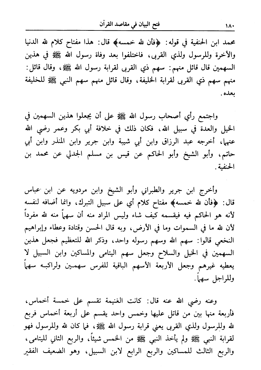 واجتمع رأي أصحاب رسول الله - صلى الله عليه وسلم - على أن يجعلوا هذين السهمين في الخيل والعدة في سبيل الله، فكان ذلك في خلافة أبي بكر وعمر رضي الله عنهما، أخرجه عبد الرزاق وابن أبي شيبة وابن جرير وابن المنذر وابن أبي حاتم، وأبو الشيخ وأبو الحاكم عن قيس بن مسلم الجدلي عن محمد بن الحنفية.