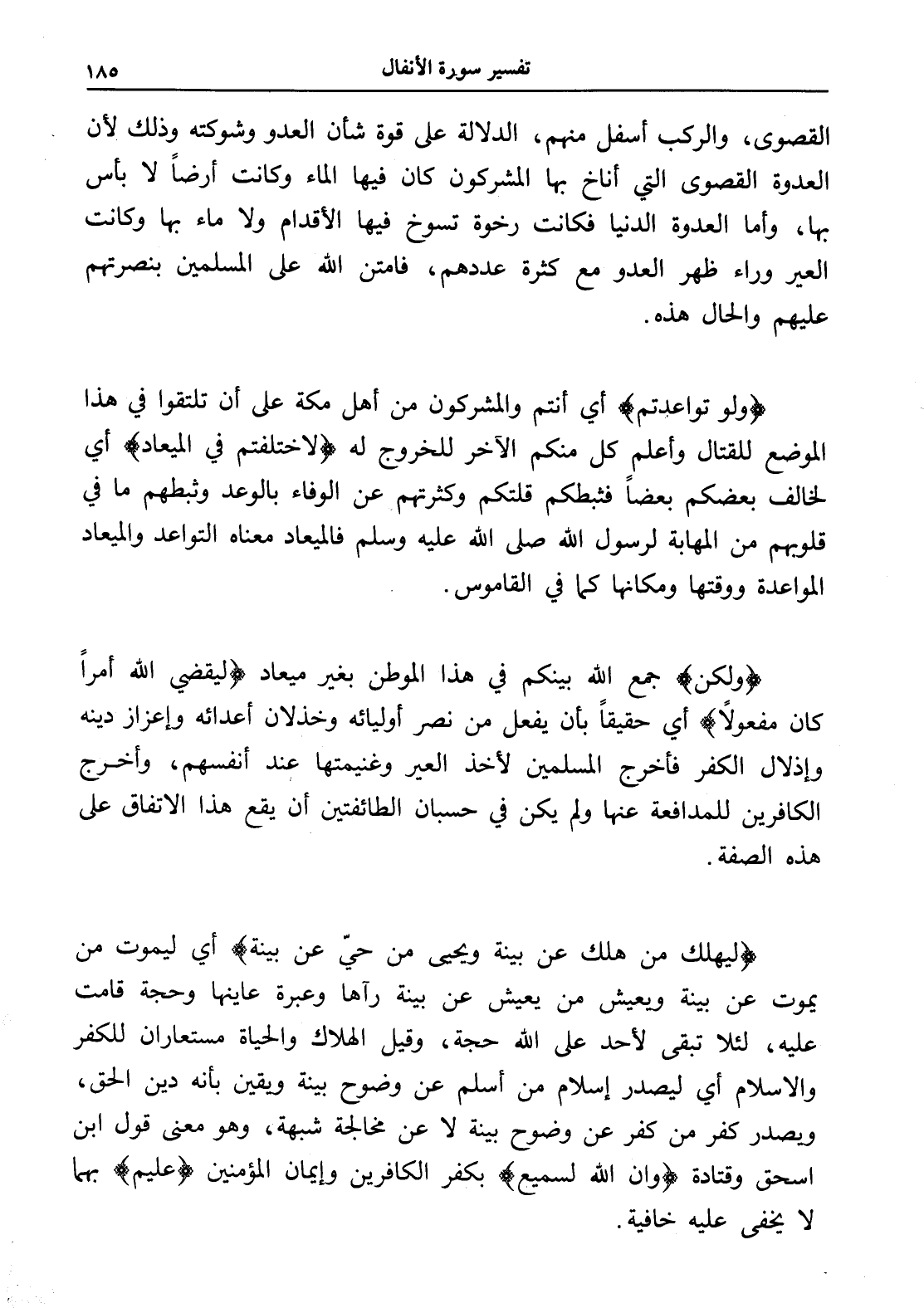 (ولكن) جمع الله بينكم في هذا الموطن بغير ميعاد (ليقضي الله أمراً كان مفعولاً) أي حقيقاً بأن يفعل من نصر أوليائه وخذلان أعدائه وإعزاز دينه وإذلال الكفر فأخرج المسلمين لأخذ العير وغنيمتها عند أنفسهم، وأخرج الكافرين للمدافعة عنها ولم يكن في حسبان الطائفتين أن يقع هذا الاتفاق على هذه الصفة.