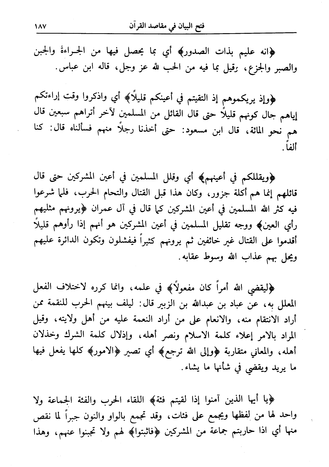 (ليقضي الله أمراً كان مفعولاً) في علمه، وإنما كرره لاختلاف الفعل المعلل به، عن عباد بن عبد الله بن الزبير قال: ليلف بينهم الحرب للنقمة ممن أراد الانتقام منه، والأنعام على من أراد النعمة عليه من أهل ولايته، وقيل المراد بالأمر إعلاء كلمة الإسلام ونصر أهله، وإذلال كلمة الشرك وخذلان أهله، والمعاني متقاربة (وإلى الله ترجع) أي تصير (الأمور) كلها يفعل فيها ما يريد ويقضي في شأنها ما يشاء.