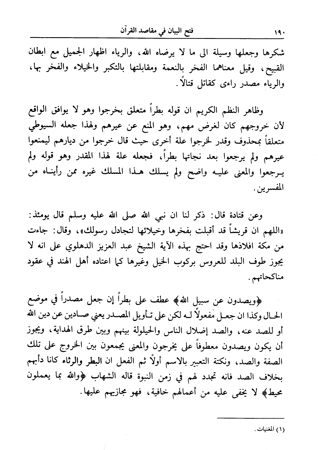 وظاهر النظم الكريم أن قوله بطراً متعلق بخرجوا وهو لا يوافق الواقع لأن خروجهم كان لغرض مهم، وهو المنع عن عيرهم ولهذا جعله السيوطي متعلقاً بمحذوف وقدر لخرجوا علة أخرى حيث قال خرجوا من ديارهم ليمنعوا عيرهم ولم يرجعوا بعد نجاتها بطراً، فجعله علة لهذا المقدر وهو قوله ولم يرجعوا والمعنى عليه واضح ولم يسلك هذا المسلك غيره ممن رأيناه من المفسرين.