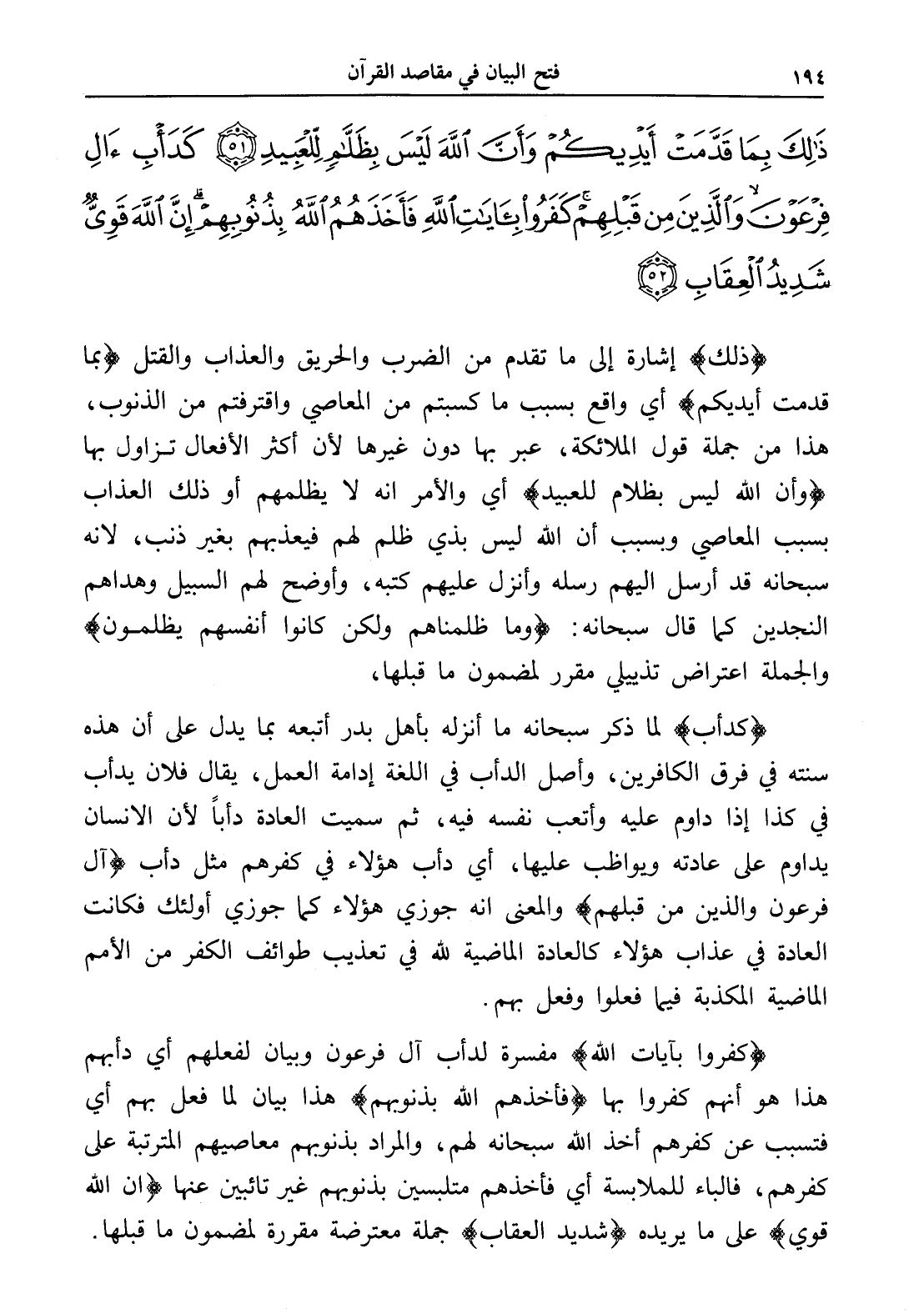 ذَلِكَ بِمَا قَدَّمَتْ أَيْدِيكُمْ وَأَنَّ اللَّهَ لَيْسَ بِظَلَّامٍ لِلْعَبِيدِ (51) كَدَأْبِ آلِ فِرْعَوْنَ وَالَّذِينَ مِنْ قَبْلِهِمْ كَفَرُوا بِآيَاتِ اللَّهِ فَأَخَذَهُمُ اللَّهُ بِذُنُوبِهِمْ إِنَّ اللَّهَ قَوِيٌّ شَدِيدُ الْعِقَابِ