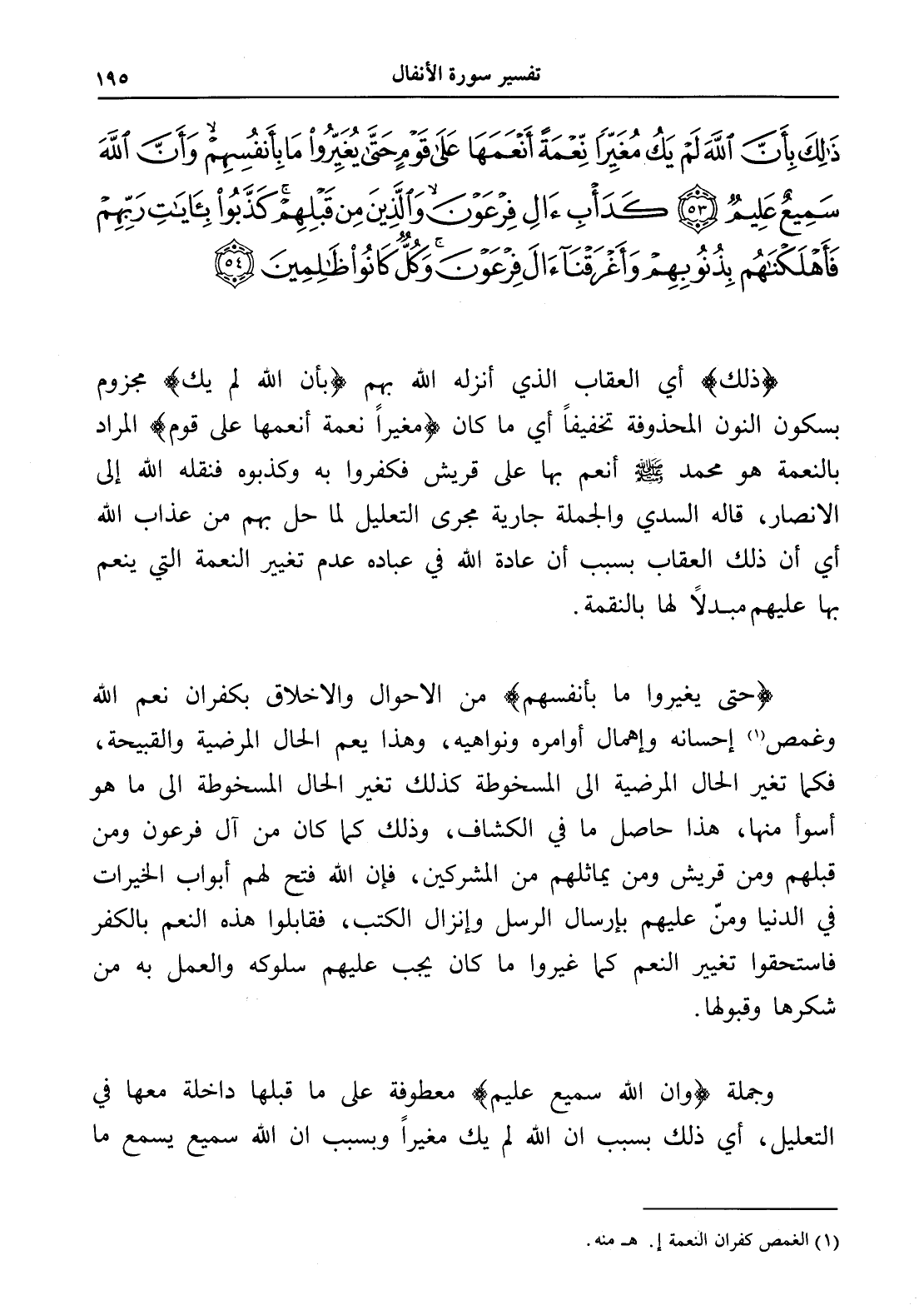 ذَلِكَ بِأَنَّ اللَّهَ لَمْ يَكُ مُغَيِّرًا نِعْمَةً أَنْعَمَهَا عَلَى قَوْمٍ حَتَّى يُغَيِّرُوا مَا بِأَنْفُسِهِمْ وَأَنَّ اللَّهَ سَمِيعٌ عَلِيمٌ (53) كَدَأْبِ آلِ فِرْعَوْنَ وَالَّذِينَ مِنْ قَبْلِهِمْ كَذَّبُوا بِآيَاتِ رَبِّهِمْ فَأَهْلَكْنَاهُمْ بِذُنُوبِهِمْ وَأَغْرَقْنَا آلَ فِرْعَوْنَ وَكُلٌّ كَانُوا ظَالِمِينَ