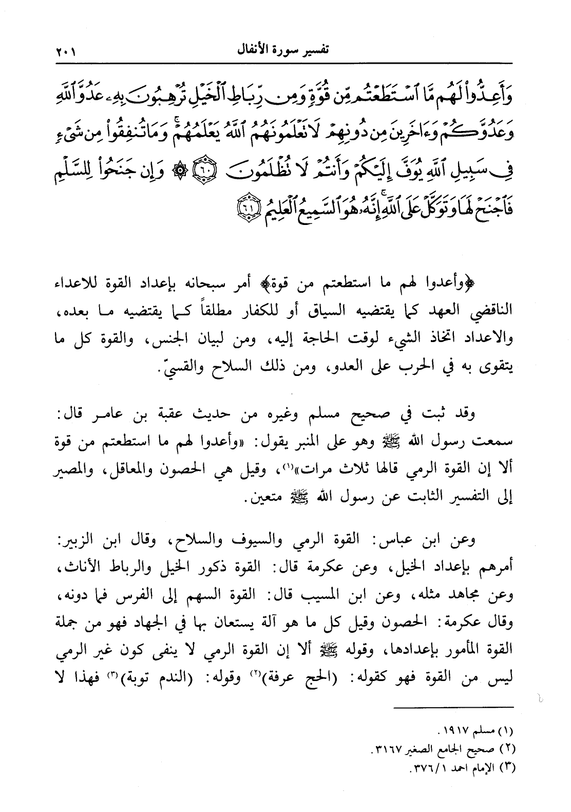 وَأَعِدُّوا لَهُمْ مَا اسْتَطَعْتُمْ مِنْ قُوَّةٍ وَمِنْ رِبَاطِ الْخَيْلِ تُرْهِبُونَ بِهِ عَدُوَّ اللَّهِ وَعَدُوَّكُمْ وَآخَرِينَ مِنْ دُونِهِمْ لَا تَعْلَمُونَهُمُ اللَّهُ يَعْلَمُهُمْ وَمَا تُنْفِقُوا مِنْ شَيْءٍ فِي سَبِيلِ اللَّهِ يُوَفَّ إِلَيْكُمْ وَأَنْتُمْ لَا تُظْلَمُونَ (60) وَإِنْ جَنَحُوا لِلسَّلْمِ فَاجْنَحْ لَهَا وَتَوَكَّلْ عَلَى اللَّهِ إِنَّهُ هُوَ السَّمِيعُ الْعَلِيمُ