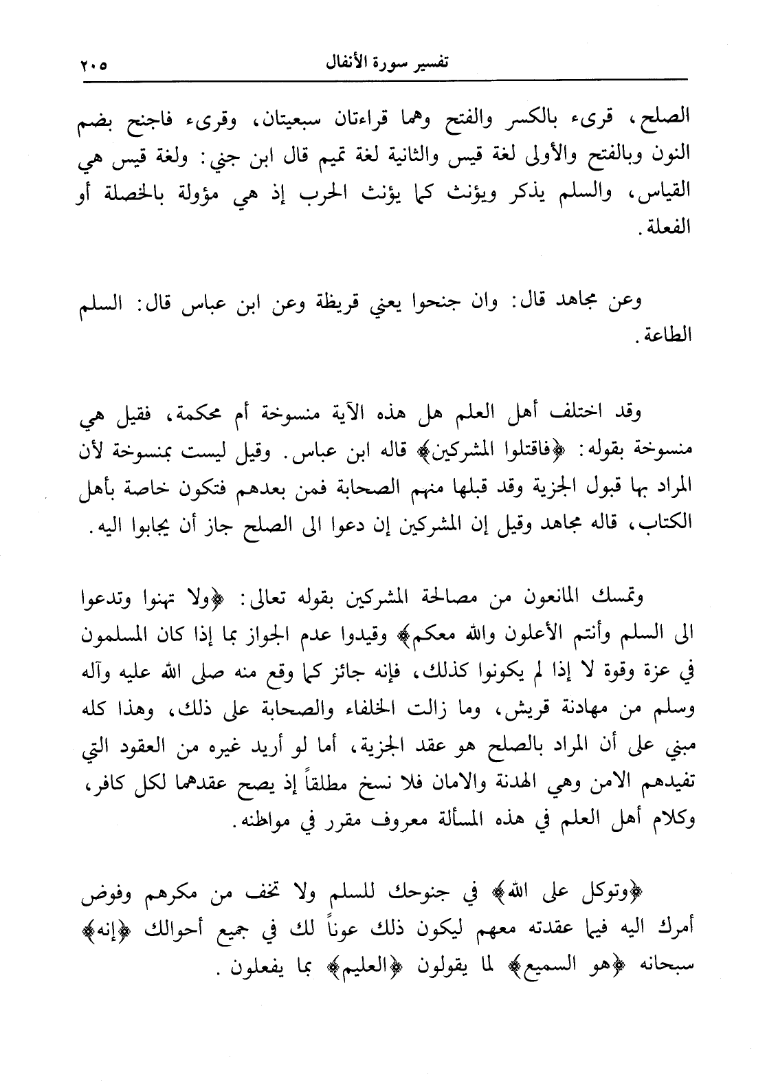 وقد اختلف أهل العلم هل هذه الآية منسوخة أم محكمة، فقيل هي منسوخة بقوله: (فاقتلوا المشركي) قاله ابن عباس. وقيل ليست بمنسوخة لأن المراد بها قبول الجزية وقد قبلها منهم الصحابة فمن بعدهم فتكون خاصة بأهل الكتاب، قاله مجاهد وقيل إن المشركين إن دعوا إلى الصلح جاز أن يجابوا إليه.