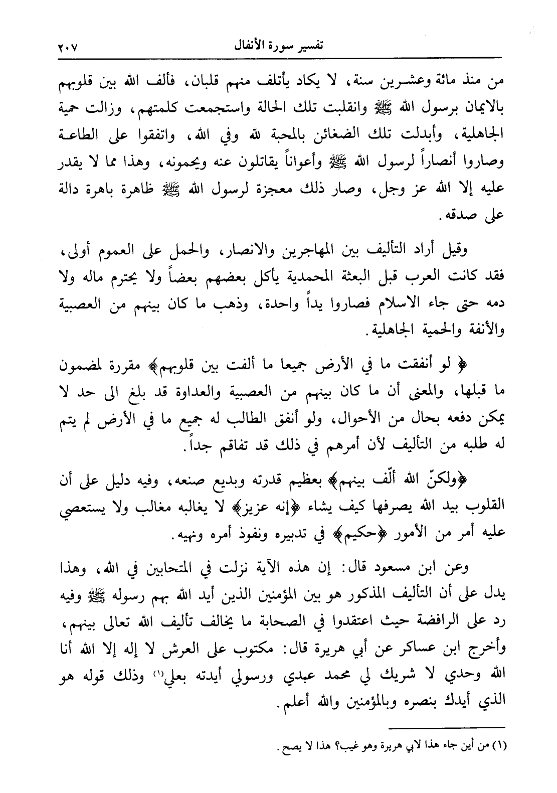 وقيل أراد التأليف بين المهاجرين والأنصار، والحمل على العموم أولى، فقد كانت العرب قبل البعثة المحمدية يأكل بعضهم بعضاً ولا يحترم ماله ولا دمه حتى جاء الإسلام فصاروا يداً واحدة، وذهب ما كان بينهم من العصبية والأنفة والحمية الجاهلية.