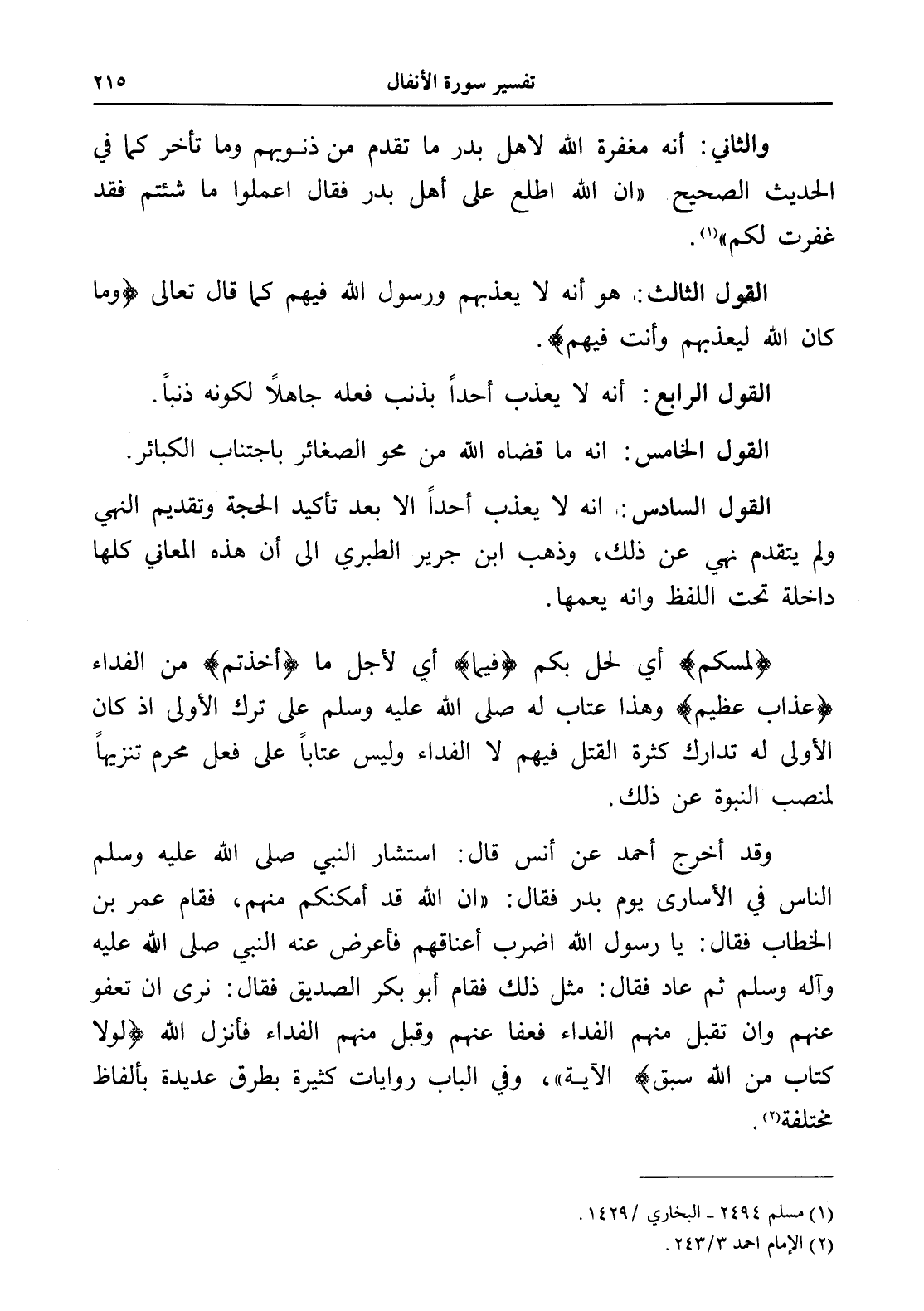 وقد أخرج أحمد عن أنس قال: استشار النبي صلى الله عليه وسلم الناس في الأسارى يوم بدر فقال: " إن الله قد أمكنكم منهم، فقام عمر بن الخطاب فقال: يا رسول الله اضرب أعناقهم فأعرض عنه النبي صلى الفه عليه وآله وسلم ثم عاد فقال: مثل ذلك فقام أبو بكر الصديق فقال: نرى أن تعفو عنهم وإن تقبل منهم الفداء فعفا عنهم وقبل منهم الفداء فأنزل الله ولولا كتاب من الله سبق) الآية "، وفي الباب روايات كثيرة بطرق عديدة بألفاظ مختلفة (¬2).
