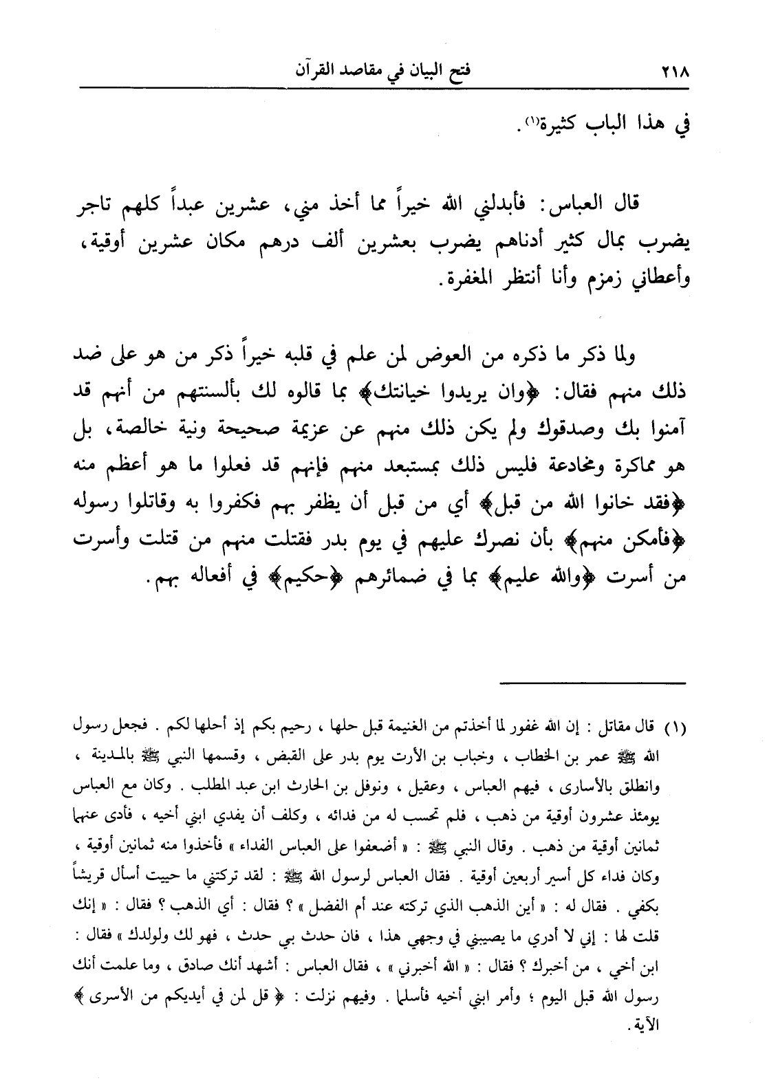 (¬1) قال مقاتل: إن الله غفور لما أخذتم من الغنيمة قبل حلها، رحيم بكم إذ أحلها لكم. فجعل رسول الله ينهييه عمر بن الخطاب، وخباب بن الأرت يوم بدر على القبض، وقسمها النبي - صلى الله عليه وسلم - بالمدينة، وانطلق بالأسارى، فيهم العباس، وعقيل، ونوفل بن الحارث ابن عبد المطلب. وكان مع العباس يومئذ عشرون أوقية من ذهب، فلم تحسب له من فدائه، وكلف أن يفدي ابني أخيه، فأدى عنهما ثمانين أوقية من ذهب. وقال النبي - صلى الله عليه وسلم -: " أضعفوا على العباس الفداء " فأخذوا منه ثمانين) وقية، وكان فداء كل أسير أربعين أوقية. فقال العباس لرسول الله - صلى الله عليه وسلم -: لقد تركتني ما حييت أسأل قريشاً بكفي. فقال له: " أين الذهب الذي تركته عند أم الفضل "؟ فقال: أي الذهب؟ فقال: " إنك قلت لها: إني لا أدري ما يصيبني في وجهي هذا، فإن حدث بي حدث، فهو لك ولولدك " فقال: ابن أخي، من أخبرك؟ فقال: " الله أخبرني "، فقال العباس: أشهد أنك صادق، وما علمت أنك رسول الله قبل اليوم؛ وأمر ابني أخيه فأسلما. وفيهم نزلت: (قل لمن في أيديكم من الأسرى) الآية.