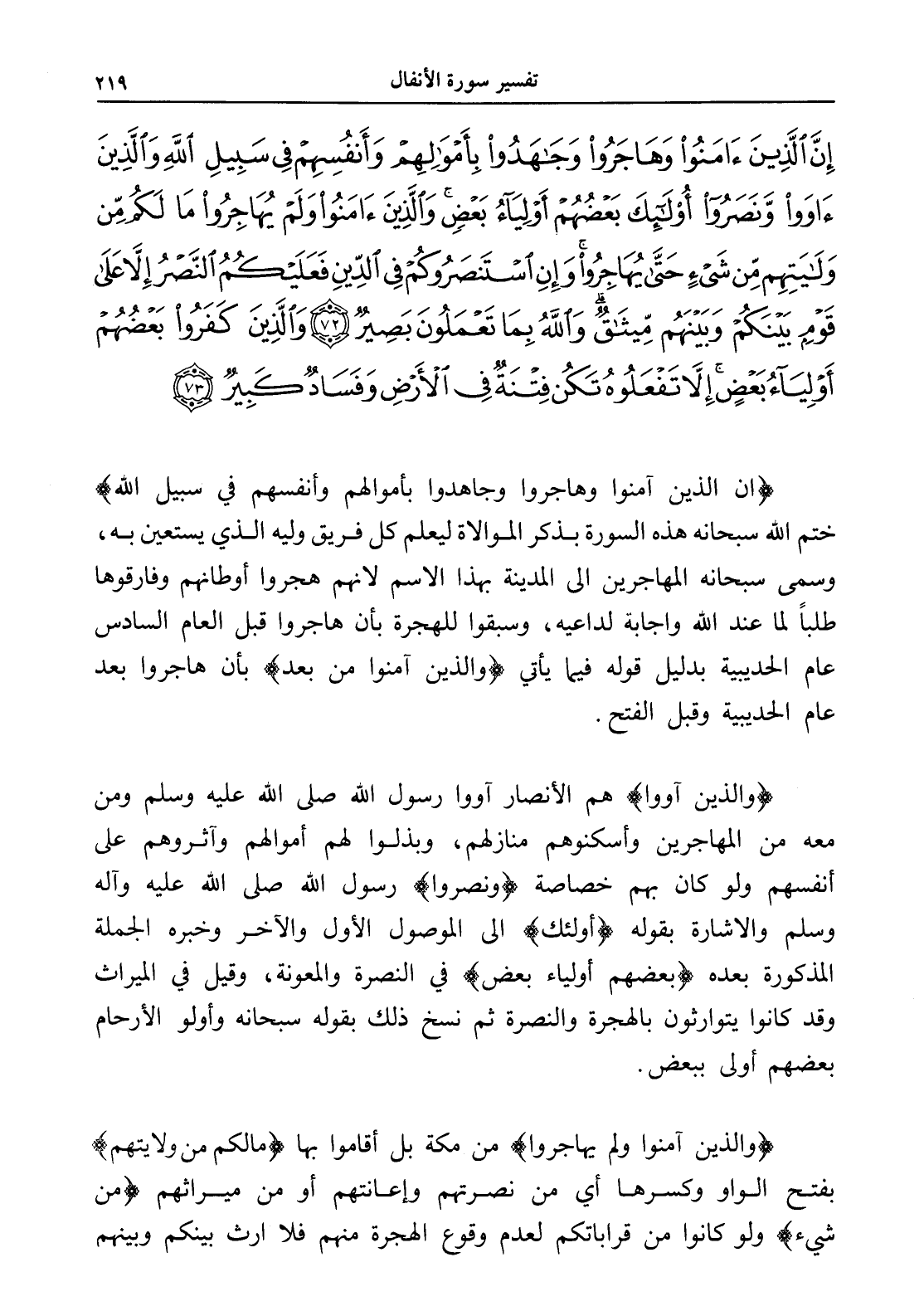 إِنَّ الَّذِينَ آمَنُوا وَهَاجَرُوا وَجَاهَدُوا بِأَمْوَالِهِمْ وَأَنْفُسِهِمْ فِي سَبِيلِ اللَّهِ وَالَّذِينَ آوَوْا وَنَصَرُوا أُولَئِكَ بَعْضُهُمْ أَوْلِيَاءُ بَعْضٍ وَالَّذِينَ آمَنُوا وَلَمْ يُهَاجِرُوا مَا لَكُمْ مِنْ وَلَايَتِهِمْ مِنْ شَيْءٍ حَتَّى يُهَاجِرُوا وَإِنِ اسْتَنْصَرُوكُمْ فِي الدِّينِ فَعَلَيْكُمُ النَّصْرُ إِلَّا عَلَى قَوْمٍ بَيْنَكُمْ وَبَيْنَهُمْ مِيثَاقٌ وَاللَّهُ بِمَا تَعْمَلُونَ بَصِيرٌ (72) وَالَّذِينَ كَفَرُوا بَعْضُهُمْ أَوْلِيَاءُ بَعْضٍ إِلَّا تَفْعَلُوهُ تَكُنْ فِتْنَةٌ فِي الْأَرْضِ وَفَسَادٌ كَبِيرٌ