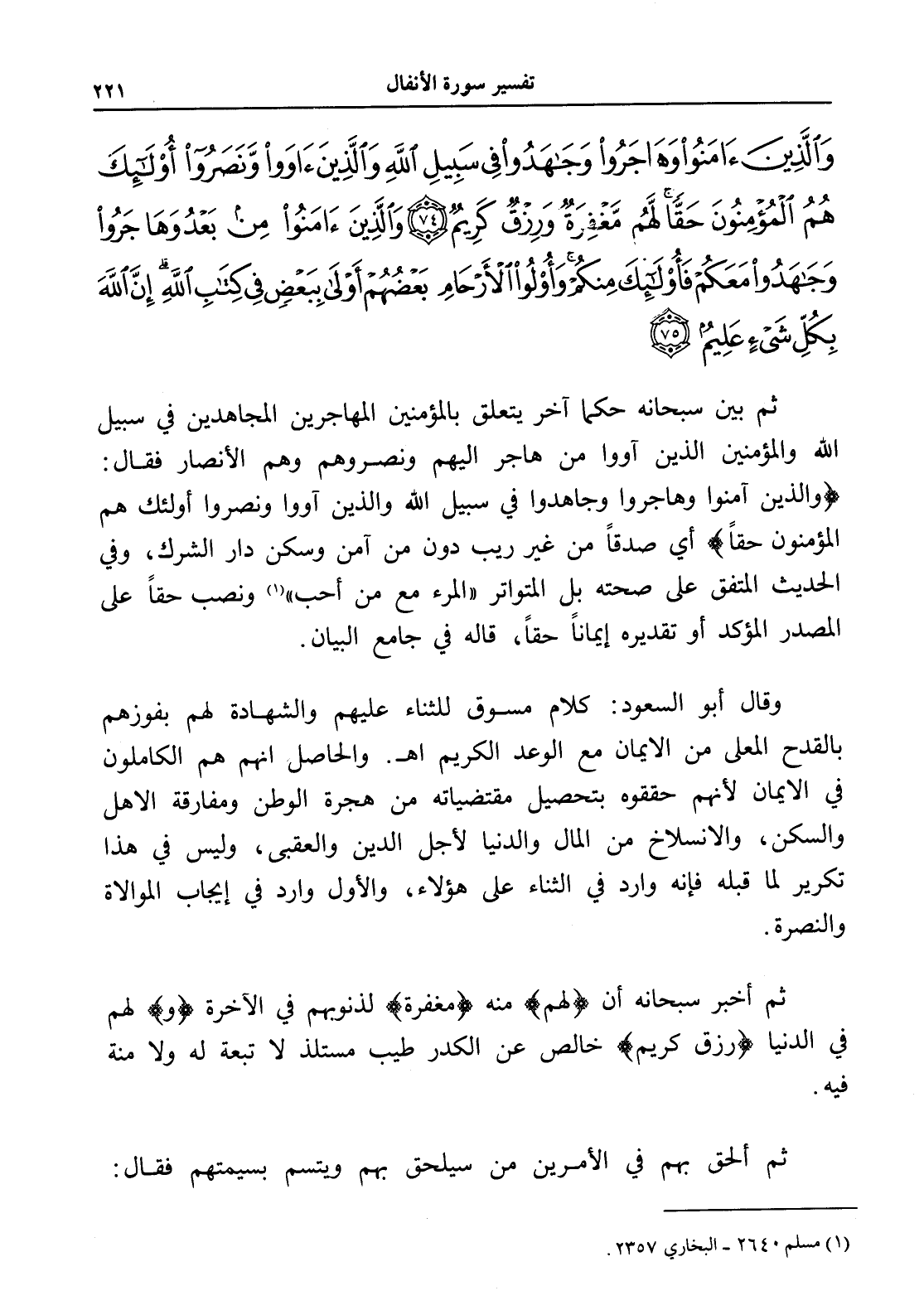 وَالَّذِينَ آمَنُوا وَهَاجَرُوا وَجَاهَدُوا فِي سَبِيلِ اللَّهِ وَالَّذِينَ آوَوْا وَنَصَرُوا أُولَئِكَ هُمُ الْمُؤْمِنُونَ حَقًّا لَهُمْ مَغْفِرَةٌ وَرِزْقٌ كَرِيمٌ (74) وَالَّذِينَ آمَنُوا مِنْ بَعْدُ وَهَاجَرُوا وَجَاهَدُوا مَعَكُمْ فَأُولَئِكَ مِنْكُمْ وَأُولُو الْأَرْحَامِ بَعْضُهُمْ أَوْلَى بِبَعْضٍ فِي كِتَابِ اللَّهِ إِنَّ اللَّهَ بِكُلِّ شَيْءٍ عَلِيمٌ
