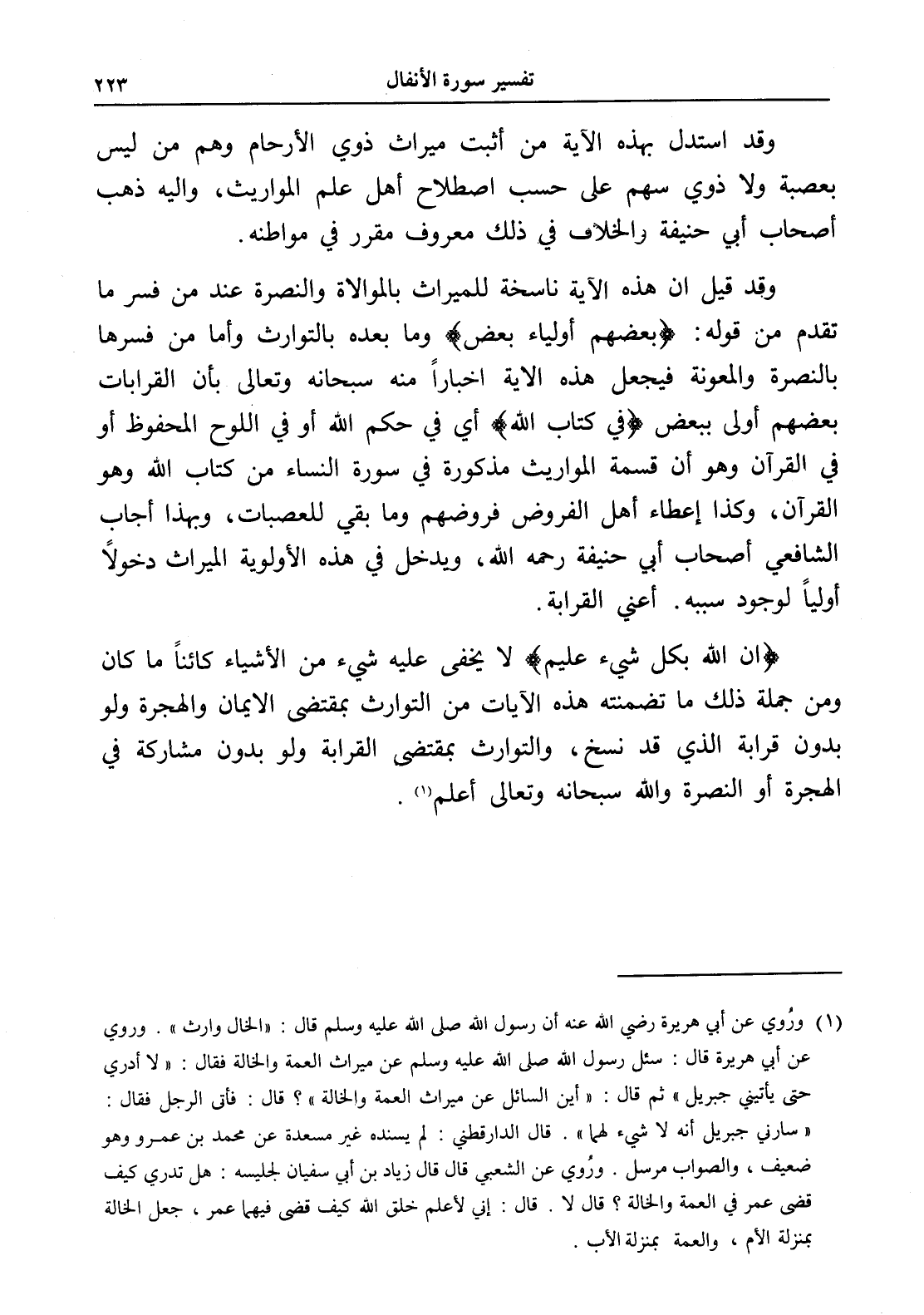 وقد استدل بهذه الآية من أثبت ميراث ذوي الأرحام وهم من ليس بعصبة ولا ذوي سهم على حسب اصطلاح أهل علم المواريث، وإليه ذهب أصحاب أبي حنيفة والخلاف في ذلك معروف مقرر في مواطنه.