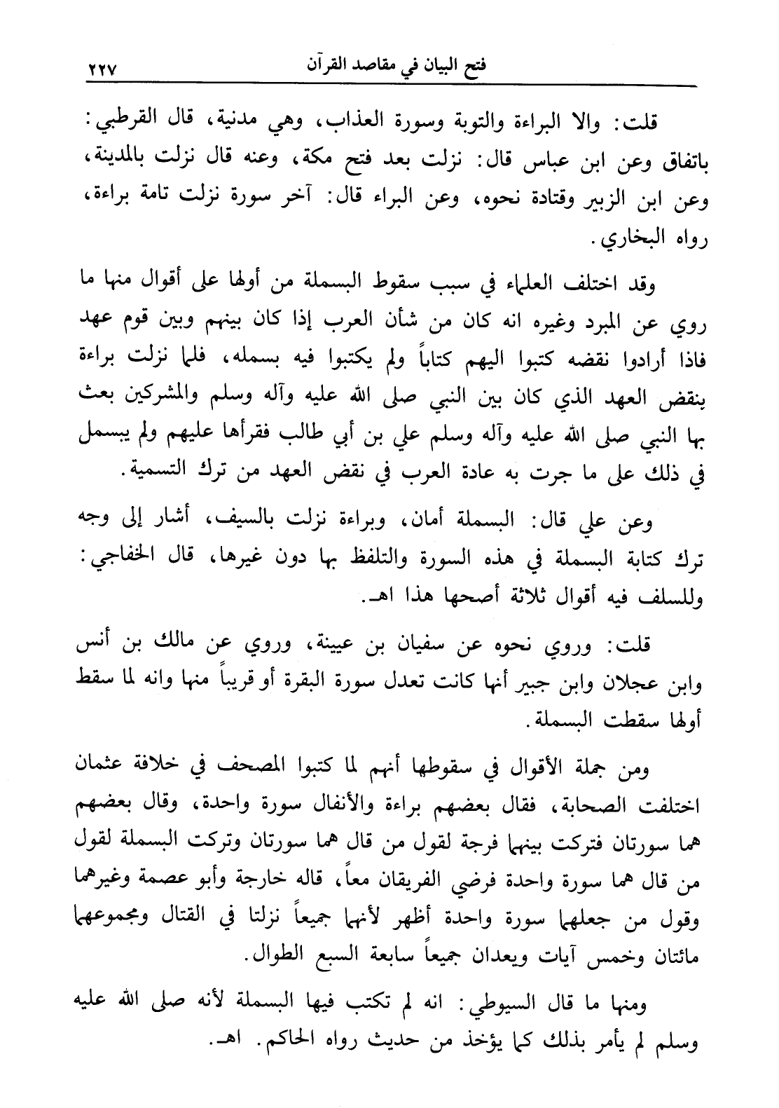 ومن جملة الأقوال في سقوطها أنهم لما كتبوا المصحف في خلافة عثمان اختلفت الصحابة، فقال بعضهم براءة والأنفال سورة واحدة، وقال بعضهم هما سورتان فتركت بينهما فرجة لقول من قال هما سورتان وتركت البسملة لقول من قال هما سورة واحدة فرضي الفريقان معاً، قاله خارجة وأبو عصمة وغيرهما وقول من جعلهما سورة واحدة أظهر لأنهما جميعاً نزلتا في القتال ومجموعهما مائتان وخمس آيات ويعدان جميعاً سابعة السبع الطوال.