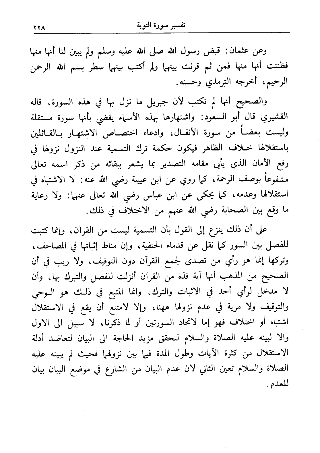 وعن عثمان: قبض رسول الله صلى الله عليه وسلم ولم يبين لنا أنها منها فظننت أنها منها فمن ثم قرنت بينهما ولم أكتب بينهما سطر بسم الله الرحمن الرحيم، أخرجه الترمذي وحسنه.