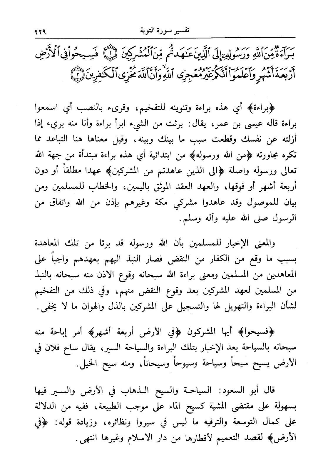بَرَاءَةٌ مِنَ اللَّهِ وَرَسُولِهِ إِلَى الَّذِينَ عَاهَدْتُمْ مِنَ الْمُشْرِكِينَ (1) فَسِيحُوا فِي الْأَرْضِ أَرْبَعَةَ أَشْهُرٍ وَاعْلَمُوا أَنَّكُمْ غَيْرُ مُعْجِزِي اللَّهِ وَأَنَّ اللَّهَ مُخْزِي الْكَافِرِينَ