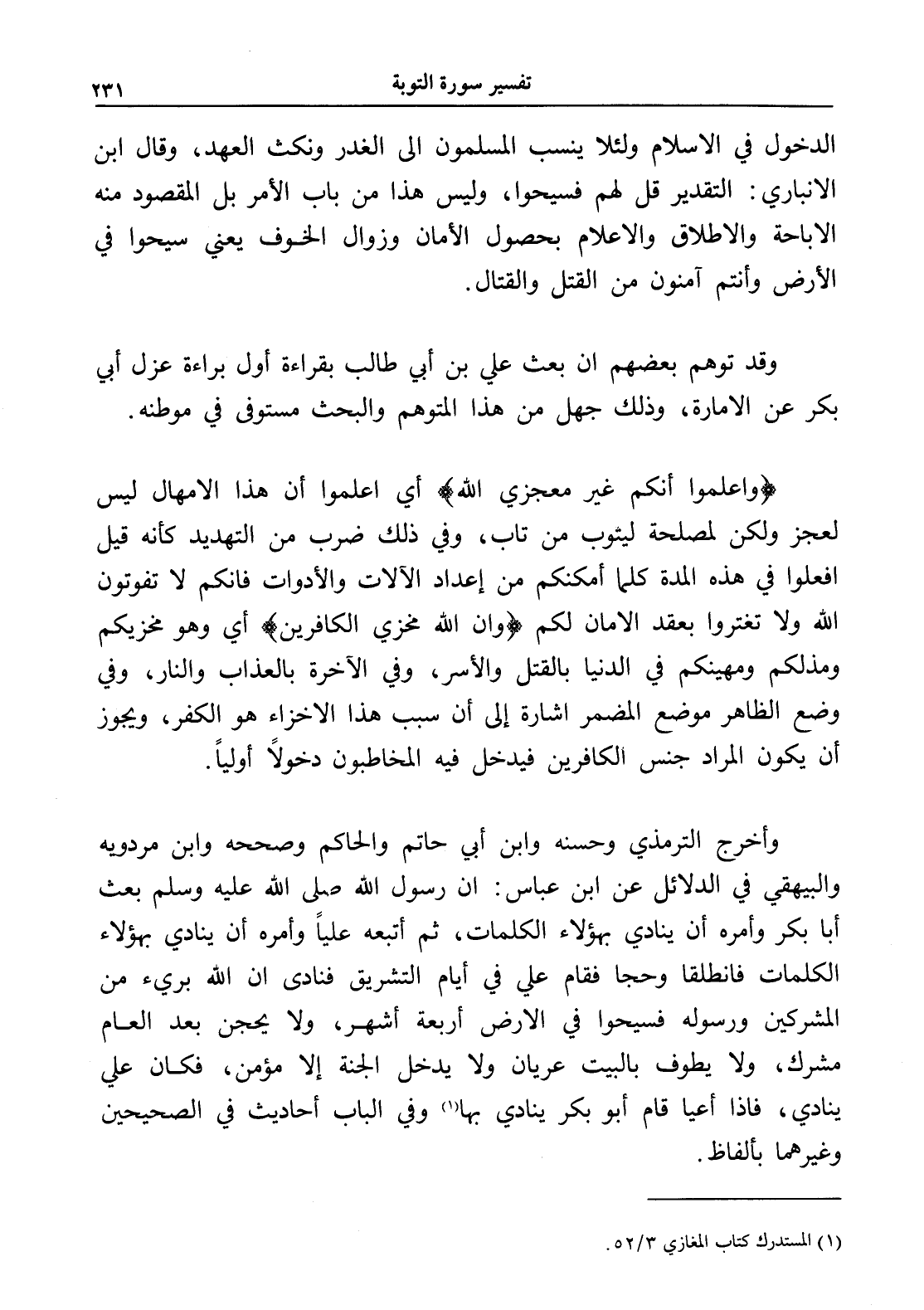 وأخرج الترمذي وحسنه وابن أبي حاتم والحاكم وصححه وابن مردويه والبيهقي في الدلائل عن ابن عباس: أن رسول الله - صلى الله عليه وسلم - بعث أبا بكر وأمره أن ينادي بهؤلاء الكلمات، ثم أتبعه علياً وأمره أن ينادي بهؤلاء الكلمات فانطلقا وحجا فقام علي في أيام التشريق فنادى أن الله بريء من المشركين ورسوله فسيحوا في الأرض أربعة أشهر، ولا يحجن بعد العام مشرك، ولا يطوف بالبيت عريان ولا يدخل الجنة إلا مؤمن، فكان علي ينادي، فإذا أعيا قام أبو بكر ينادي بها (¬1) وفي الباب أحاديث في الصحيحين وغيرهما بألفاظ.