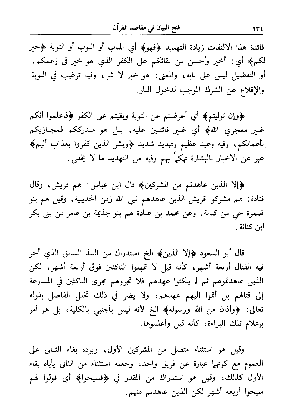 (إلا الذين عاهدتم من المشركين) قال ابن عباس: هم قريش، وقال قتادة: هم مشركو قريش الذين عاهدهم نبي الله زمن الحديبية، وقيل هم بنو ضمرة حي من كنانة، وعن محمد بن عبادة هم بنو جذيمة بن عامر من بني بكر ابن كنانة.