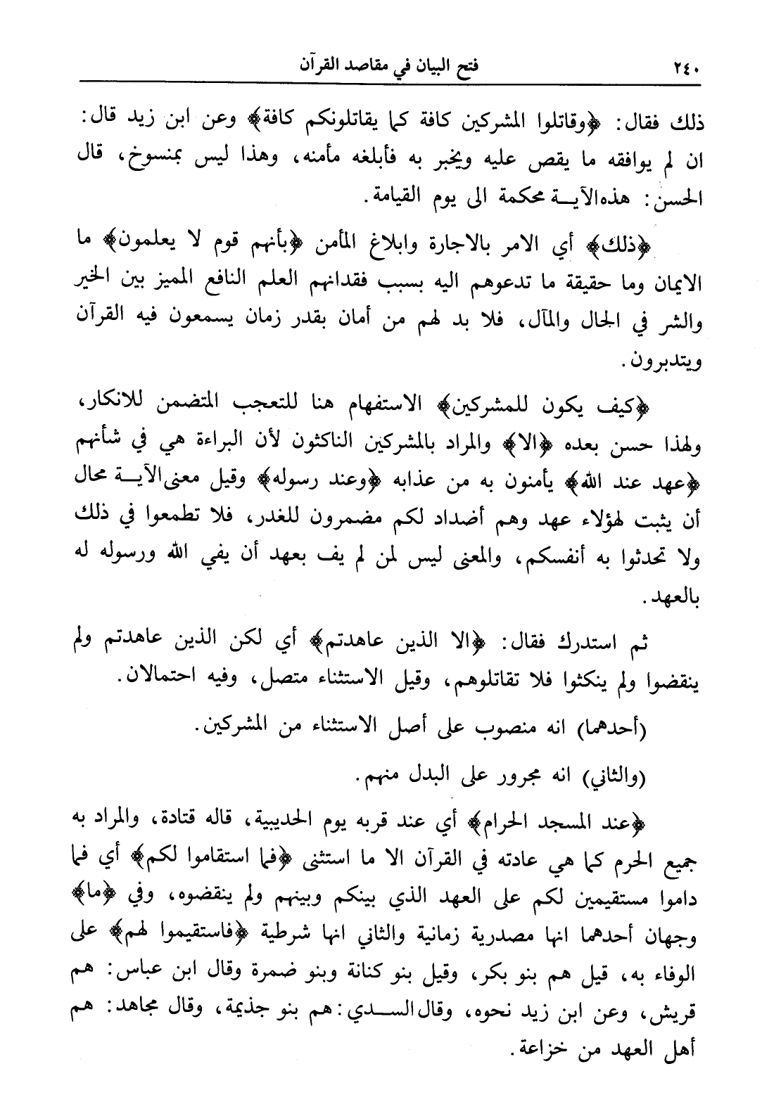 (عند المسجد الحرام) أي عند قربه يوم الحديبية، قاله قتادة، والمراد به جميع الحرم كما هي عادته في القرآن إلا ما استثنى (فما استقاموا لكم) أي فما داموا مستقيمين لكم على العهد الذي بينكم وبينهم ولم ينقضوه، وفي (ما) وجهان أحدهما أنها مصدرية زمانية والثاني أنها شرطية (فاستقيموا لهم) على الوفاء به، قيل هم بنو بكر، وقيل بنو كنانة وبنو ضمرة وقال ابن عباس: هم قريش، وعن ابن زيد نحوه، وقال السدي: هم بنو جذيمة، وقال مجاهد: هم أهل العهد من خزاعة.