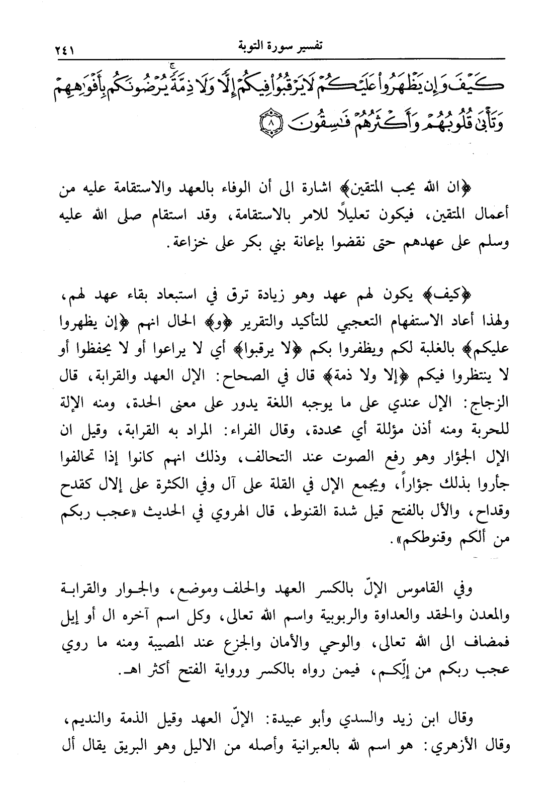 (كيف) يكون لهم عهد وهو زيادة ترق في استبعاد بقاء عهد لهم، ولهذا أعاد الاستفهام التعجبي للتأكيد والتقرير (و) الحال أنهم (إن يظهروا عليكم) بالغلبة لكم ويظفروا بكم (لا يرقبوا) أي لا يراعوا أو لا يحفظوا أو لا ينتظروا فيكم (إلا ولا ذمة) قال في الصحاح: الإل العهد والقرابة، قال الزجاج: الإل عندي على ما يوجبه اللغة يدور على معنى الحدة، ومنه الإلة للحربة ومنه أذن مؤللة أي محددة، وقال الفراء: المراد به القرابة، وقيل أن الإل الجؤار وهو رفع الصوت عند التحالف، وذلك أنهم كانوا إذا تحالفوا جاروا بذلك جؤاراً، ويجمع الإل في القلة على آل وفي الكثرة على إلال كقدح وقداح، والأل بالفتح قيل شدة القنوط، قال الهروي في الحديث " عجب ربكم من ألكم وقنوطكم ".