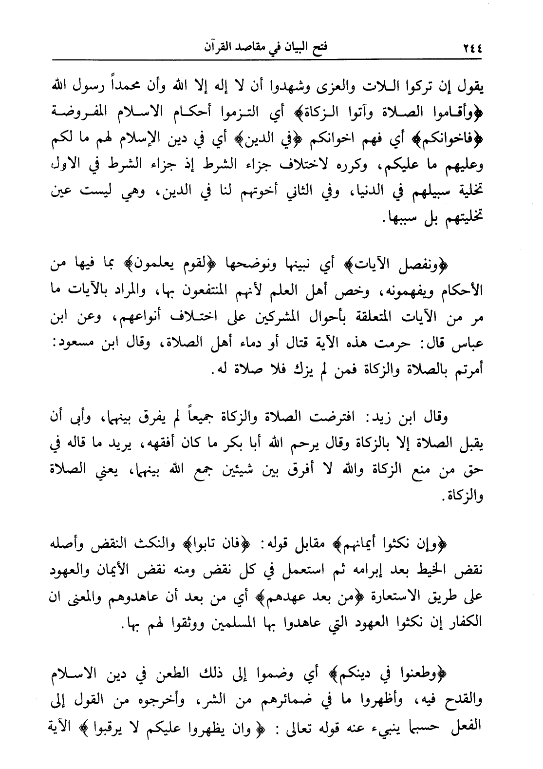 (ونفصل الآيات) أي نبينها ونوضحها (لقوم يعلمون) بما فيها من الأحكام ويفهمونه، وخص أهل العلم لأنهم المنتفعون بها، والمراد بالآيات ما مر من الآيات المتعلقة بأحوال المشركين على اختلاف أنواعهم، وعن ابن عباس قال: حرمت هذه الآية قتال أو دماء أهل الصلاة، وقال ابن مسعود: أمرتم بالصلاة والزكاة فمن لم يزك فلا صلاة له.
