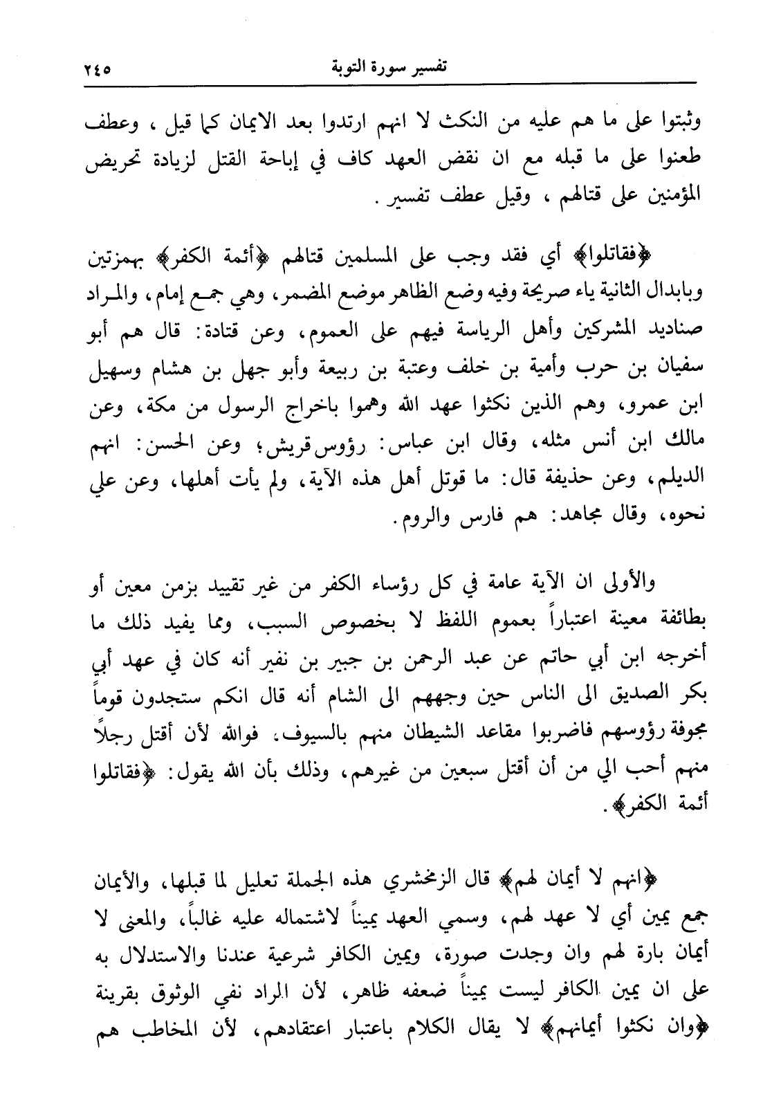 والأولى أن الآية عامة في كل رؤساء الكفر من غير تقييد بزمن معين أو بطائفة معينة اعتباراً بعموم اللفظ لا بخصوص السبب، ومما يفيد ذلك ما أخرجه ابن أبي حاتم عن عبد الرحمن بن جبير بن نفير أنه كان في عهد أبي بكر الصديق إلى الناس حين وجههم إلى الشام أنه قال إنكم ستجدون قوماً مجوفة رؤوسهم فاضربوا مقاعد الشيطان منهم بالسيوف، فوالله لأن أقتل رجلاً منهم أحب إلي من أن أقتل سبعين من غيرهم، وذلك بأن الله يقول: (فقاتلوا أئمة الكفر).
