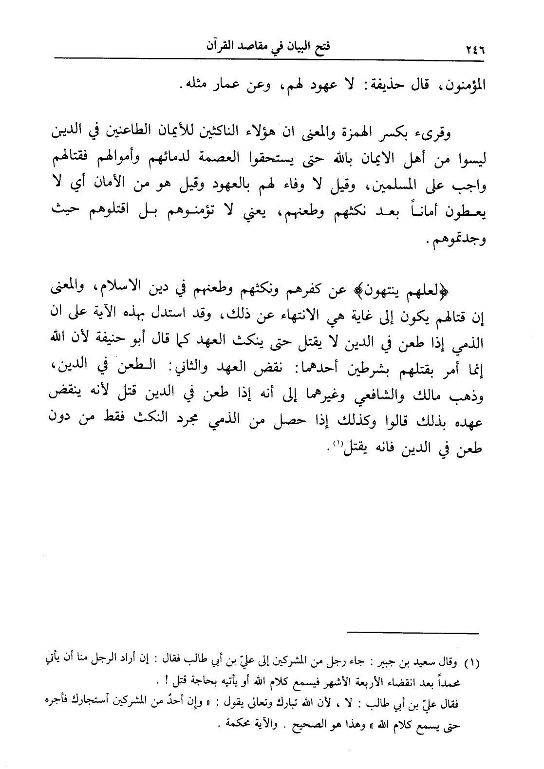 فقال عليّ بن أبي طالب: لا، لأن الله تبارك وتعالى يقول: " (وإن أحدٌ من المشركين استجارك فأجره حتى يسمع كلام الله) " وهذا هو الصحيح. والآية محكمة.