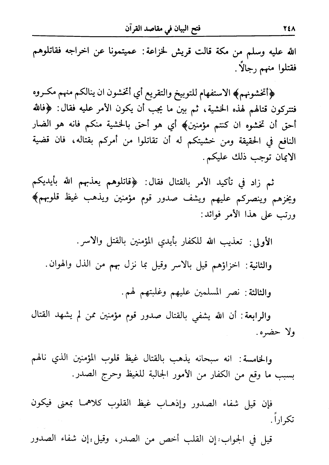 (قاتلوهم يعذبهم الله بأيديكم ويخزهم وينصركم عليهم ويشف صدور قوم مؤمنين ويذهب غيظ قلوبهم) ورتب على هذا الأمر فوائد: