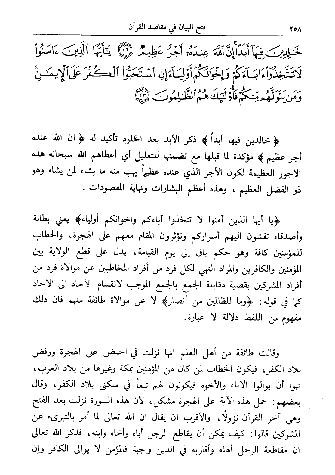 خَالِدِينَ فِيهَا أَبَدًا إِنَّ اللَّهَ عِنْدَهُ أَجْرٌ عَظِيمٌ (22) يَا أَيُّهَا الَّذِينَ آمَنُوا لَا تَتَّخِذُوا آبَاءَكُمْ وَإِخْوَانَكُمْ أَوْلِيَاءَ إِنِ اسْتَحَبُّوا الْكُفْرَ عَلَى الْإِيمَانِ وَمَنْ يَتَوَلَّهُمْ مِنْكُمْ فَأُولَئِكَ هُمُ الظَّالِمُونَ