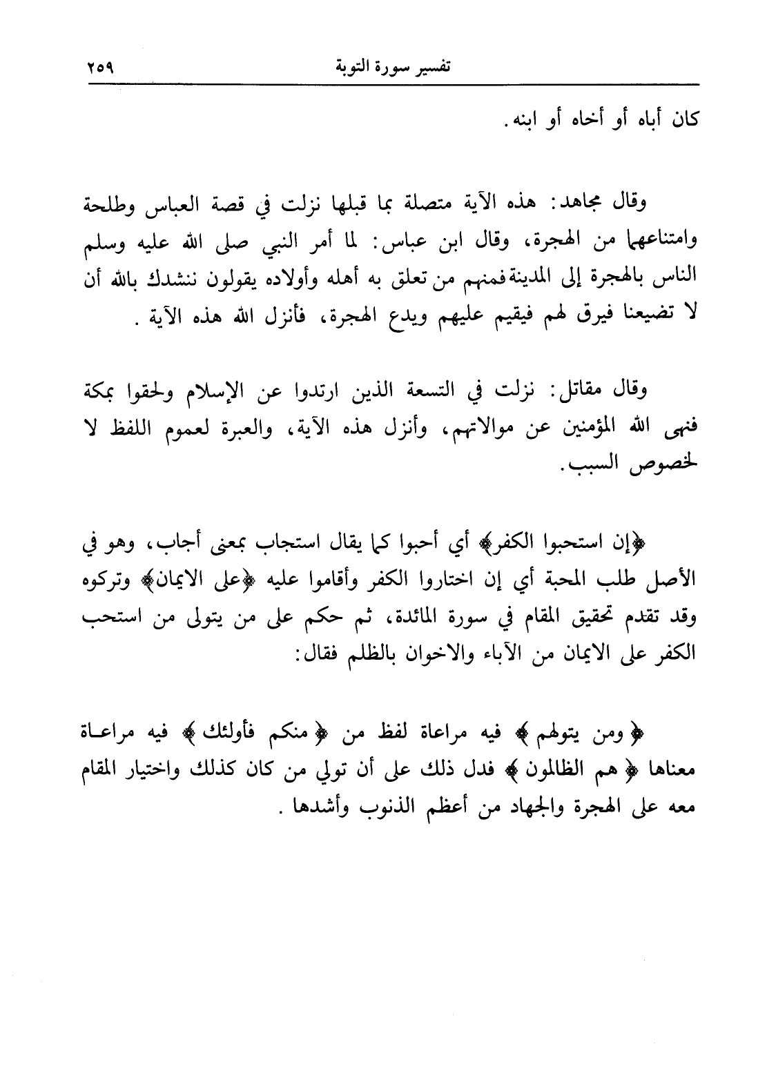 وقال مجاهد: هذه الآية متصلة بما قبلها نزلت في قصة العباس وطلحة وامتناعهما من الهجرة، وقال ابن عباس: لما أمر النبي صلى الله عليه وسلم الناس بالهجرة إلى المدينة فمنهم من تعلق به أهله وأولاده يقولون ننشدك بالله أن لا تضيعنا فيرق لهم فيقيم عليهم ويدع الهجرة، فأنزل الله هذه الآية.