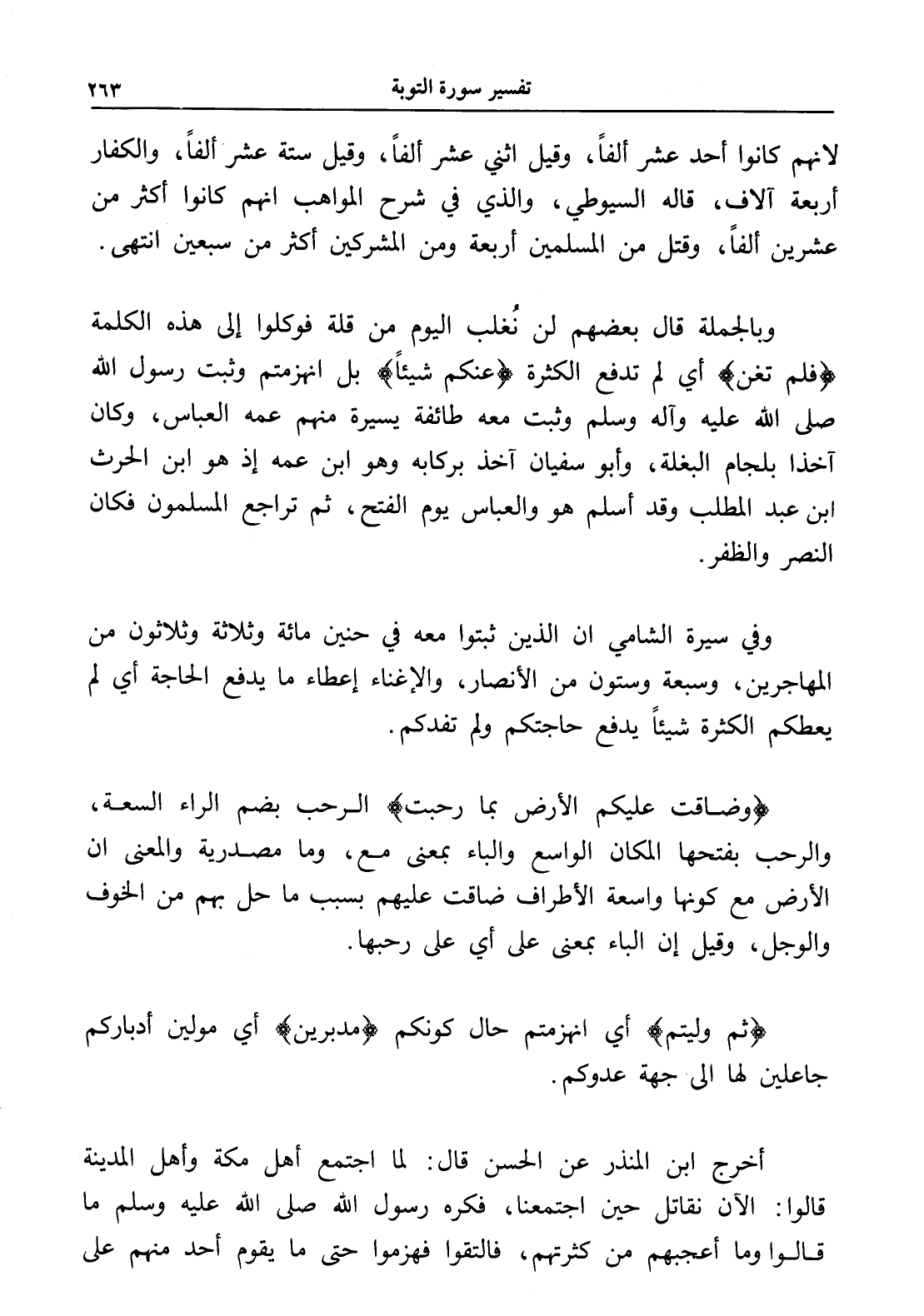 وبالجملة قال بعضهم لن نُغلب اليوم من قلة فوكلوا إلى هذه الكلمة (فلم تغن) أي لم تدفع الكثرة (عنكم شيئاً) بل انهزمتم وثبت رسول الله صلى الله عليه وآله وسلم وثبت معه طائفة يسيرة منهم عمه العباس، وكان آخذاً بلجام البغلة، وأبو سفيان آخذ بركابه وهو ابن عمه إذ هو ابن الحرث ابن عبد المطلب وقد أسلم هو والعباس يوم الفتح، ثم تراجع المسلمون فكان النصر والظفر.