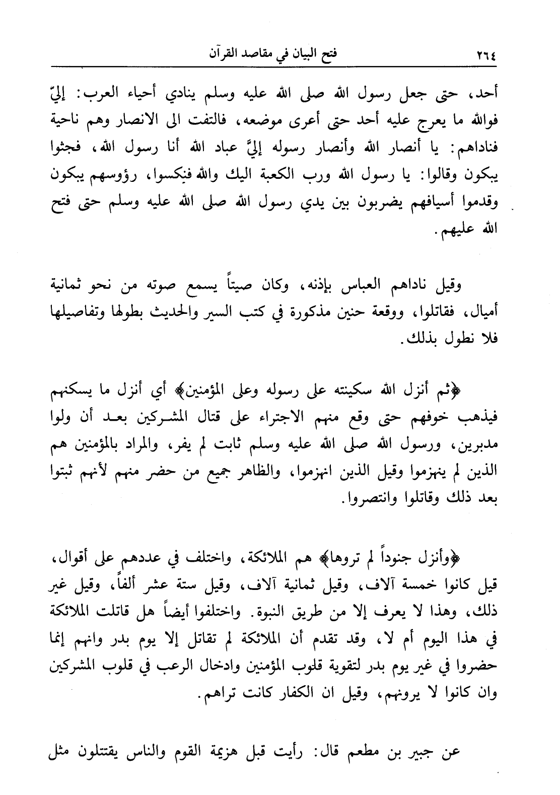 وقيل ناداهم العباس بإذنه، وكان صيتاً يسمع صوته من نحو ثمانية أميال، فقاتلوا، ووقعة حنين مذكورة في كتب السير والحديث بطولها وتفاصيلها فلا نطول بذلك.