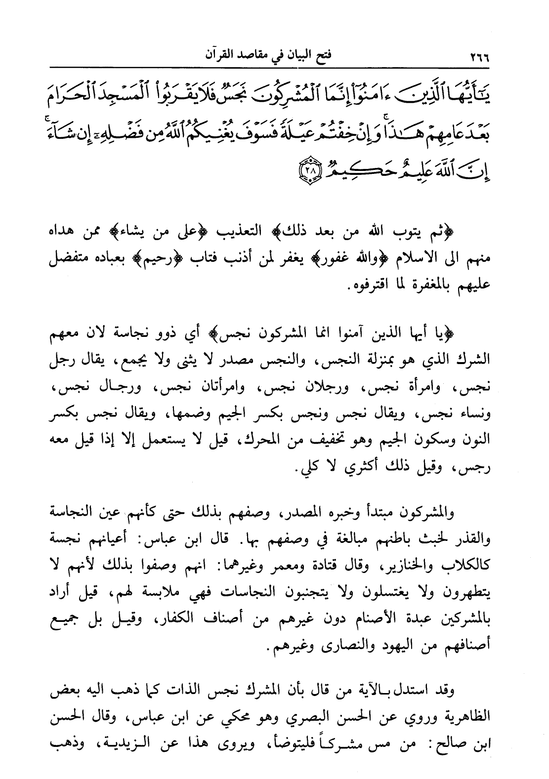 يَا أَيُّهَا الَّذِينَ آمَنُوا إِنَّمَا الْمُشْرِكُونَ نَجَسٌ فَلَا يَقْرَبُوا الْمَسْجِدَ الْحَرَامَ بَعْدَ عَامِهِمْ هَذَا وَإِنْ خِفْتُمْ عَيْلَةً فَسَوْفَ يُغْنِيكُمُ اللَّهُ مِنْ فَضْلِهِ إِنْ شَاءَ إِنَّ اللَّهَ عَلِيمٌ حَكِيمٌ