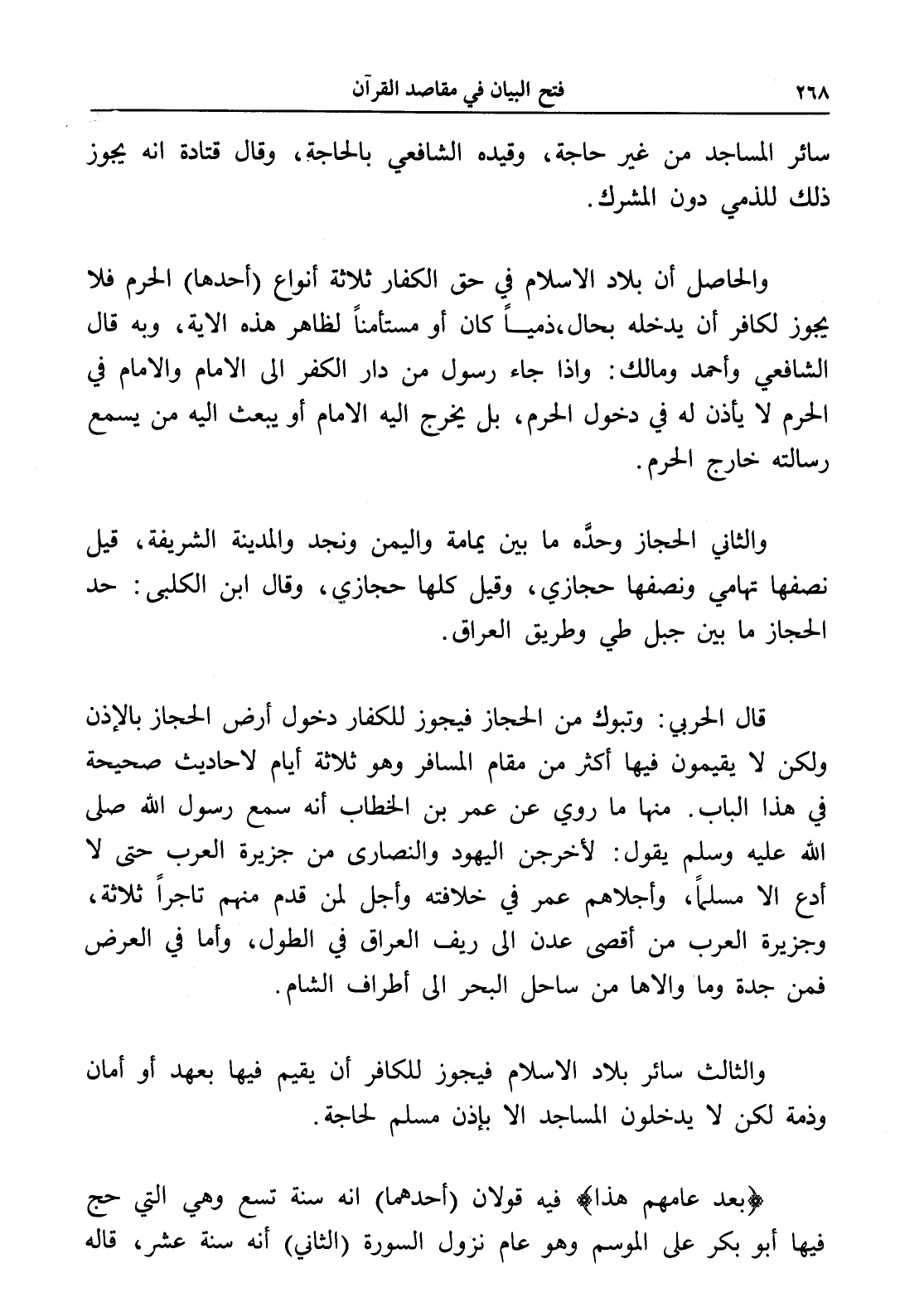 والحاصل أن بلاد الإسلام في حق الكفار ثلاثة أنواع (أحدها) الحرم فلا يجوز لكافر أن يدخله بحال، ذمياً كان أو مستأمناً لظاهر هذه الآية، وبه قال الشافعي وأحمد ومالك: وإذا جاء رسول من دار الكفر إلى الإمام والإمام في الحرم لا يأذن له في دخول الحرم، بل يخرج إليه الإمام أو يبعث إليه من يسمع رسالته خارج الحرم.