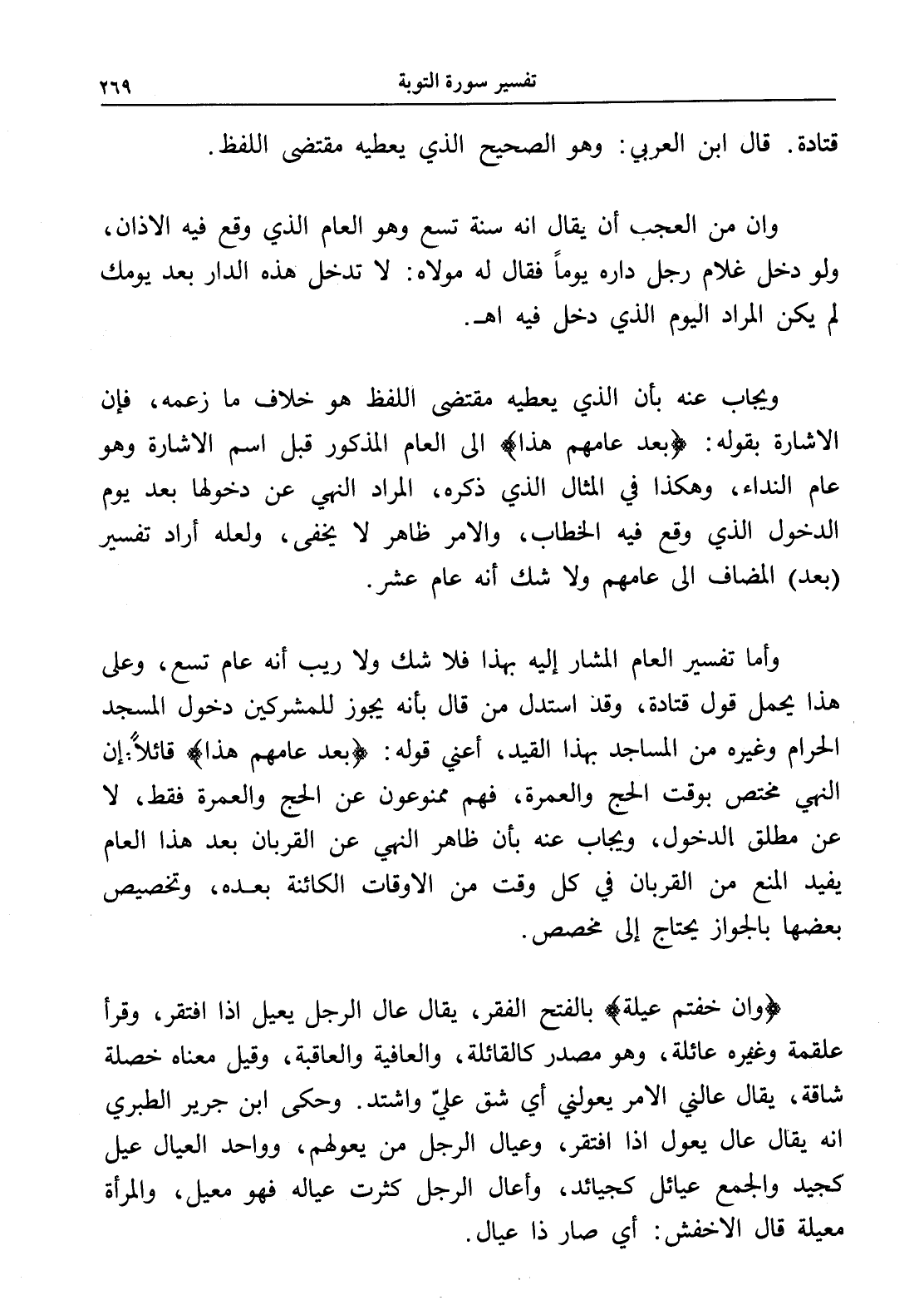 وأما تفسير العام المشار إليه بهذا فلا شك ولا ريب أنه عام تسع، وعلى هذا يحمل قول قتادة، وقذ استدل من قال بأنه يجوز للمشركين دخول المسجد الحرام وغيره من المساجد بهذا القيد، أعني قوله: (بعد عامهم هذا) قائلاً: إن النهي مختص بوقت الحج والعمرة، فهم ممنوعون عن الحج والعمرة فقط، لا عن مطلق الدخول، ويجاب عنه بأن ظاهر النهي عن القربان بعد هذا العام يفيد المنع من القربان في كل وقت من الأوقات الكائنة بعده، وتخصيص بعضها بالجواز يحتاج إلى نحصص.