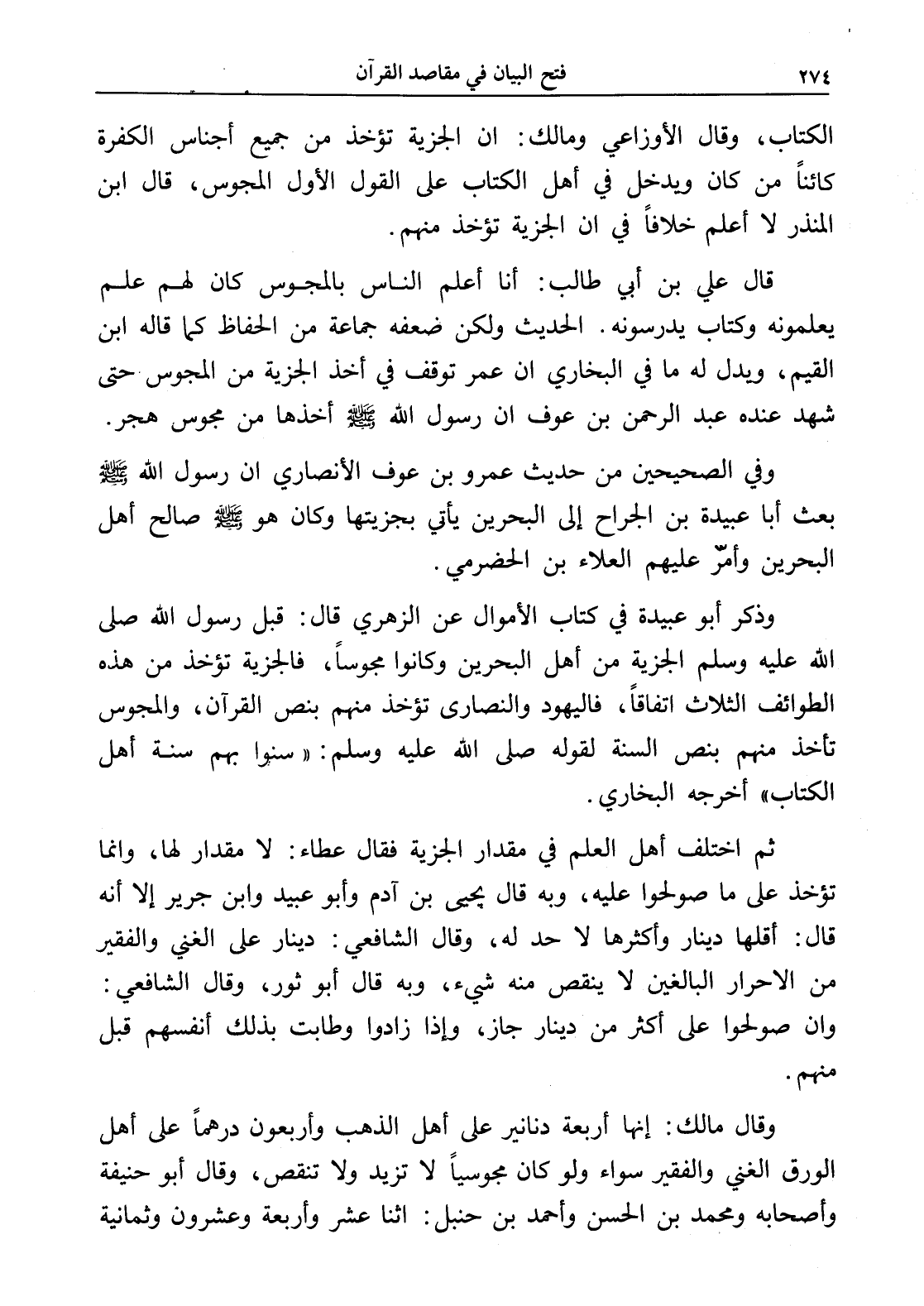 وذكر أبو عبيدة في كتاب الأموال عن الزهري قال: قبل رسول الله صلى الله عليه وسلم الجزية من أهل البحرين وكانوا مجوساً، فالجزية تؤخذ من هذه الطوائف الثلاث اتفاقاً، فاليهود والنصارى تؤخذ منهم بنص القرآن، والمجوس تأخذ منهم بنص السنة لقوله صلى الله عليه وسلم: " سنوا بهم سنة أهل الكتاب " أخرجه البخاري.