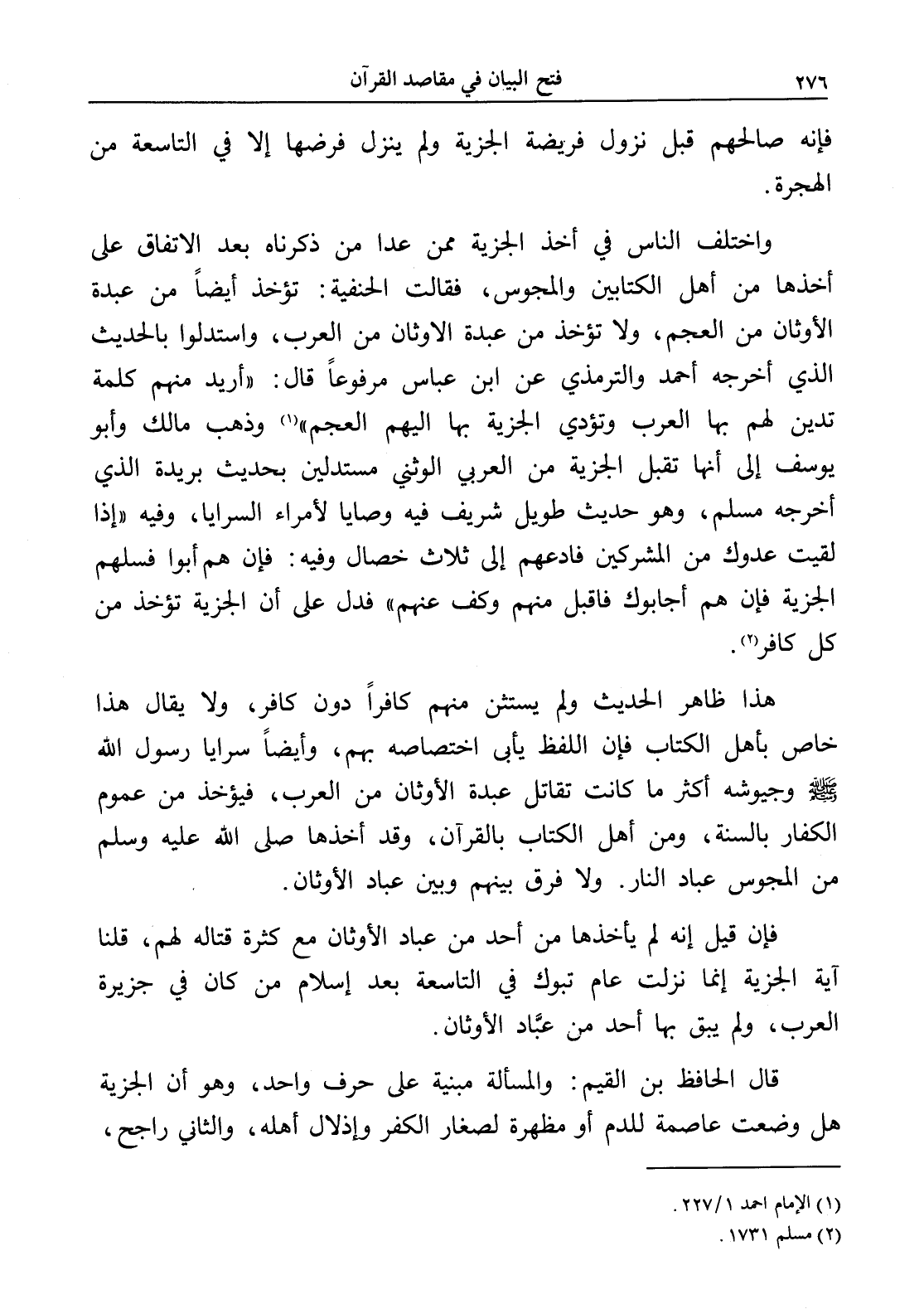 هذا ظاهر الحديث ولم يستثن منهم كافراً دون كافر، ولا يقال هذا خاص بأهل الكتاب فإن اللفظ يأبى اختصاصه بهم، وأيضاً سرايا رسول الله لمجيمّ وجيوشه أكثر ما كانت تقاتل عبدة الأوثان من العرب، فيؤخذ من عموم الكفار بالسنة، ومن أهل الكتاب بالقرآن، وقد أخذها صلى الله عليه وسلم من المجوس عباد النار. ولا فرق بينهم وبين عباد الأوثان.