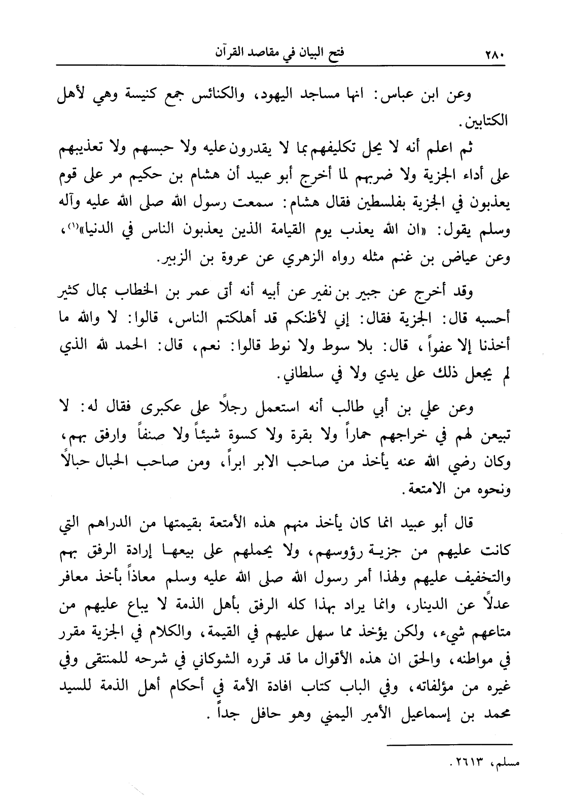 وقد أخرج عن جبير بن نفير عن أبيه أنه أتى عمر بن الخطاب بمال كثير أحسبه قال: الجزية فقال: إني لأظنكم قد أهلكتم الناس، قالوا: لا والله ما أخذنا إلا عفواً، قال: بلا سوط ولا نوط قالوا: نعم، قال: الحمد لله الذي لم يجعل ذلك على يدي ولا في سلطاني.