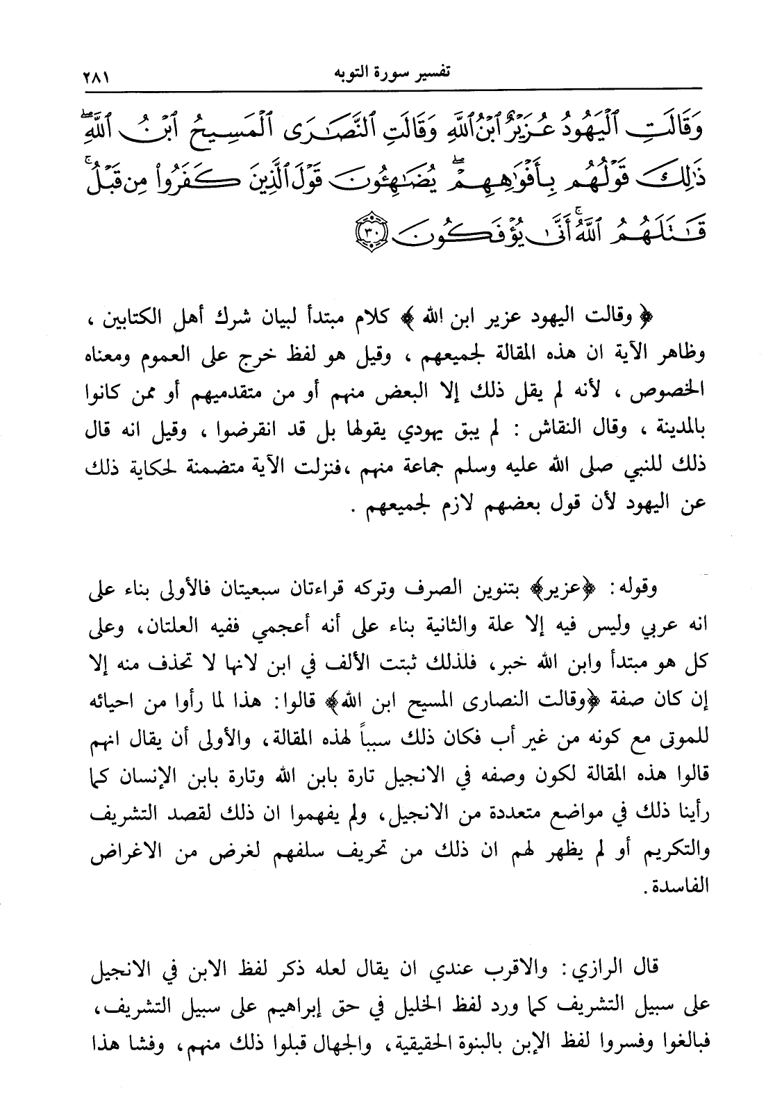 وَقَالَتِ الْيَهُودُ عُزَيْرٌ ابْنُ اللَّهِ وَقَالَتِ النَّصَارَى الْمَسِيحُ ابْنُ اللَّهِ ذَلِكَ قَوْلُهُمْ بِأَفْوَاهِهِمْ يُضَاهِئُونَ قَوْلَ الَّذِينَ كَفَرُوا مِنْ قَبْلُ قَاتَلَهُمُ اللَّهُ أَنَّى يُؤْفَكُونَ